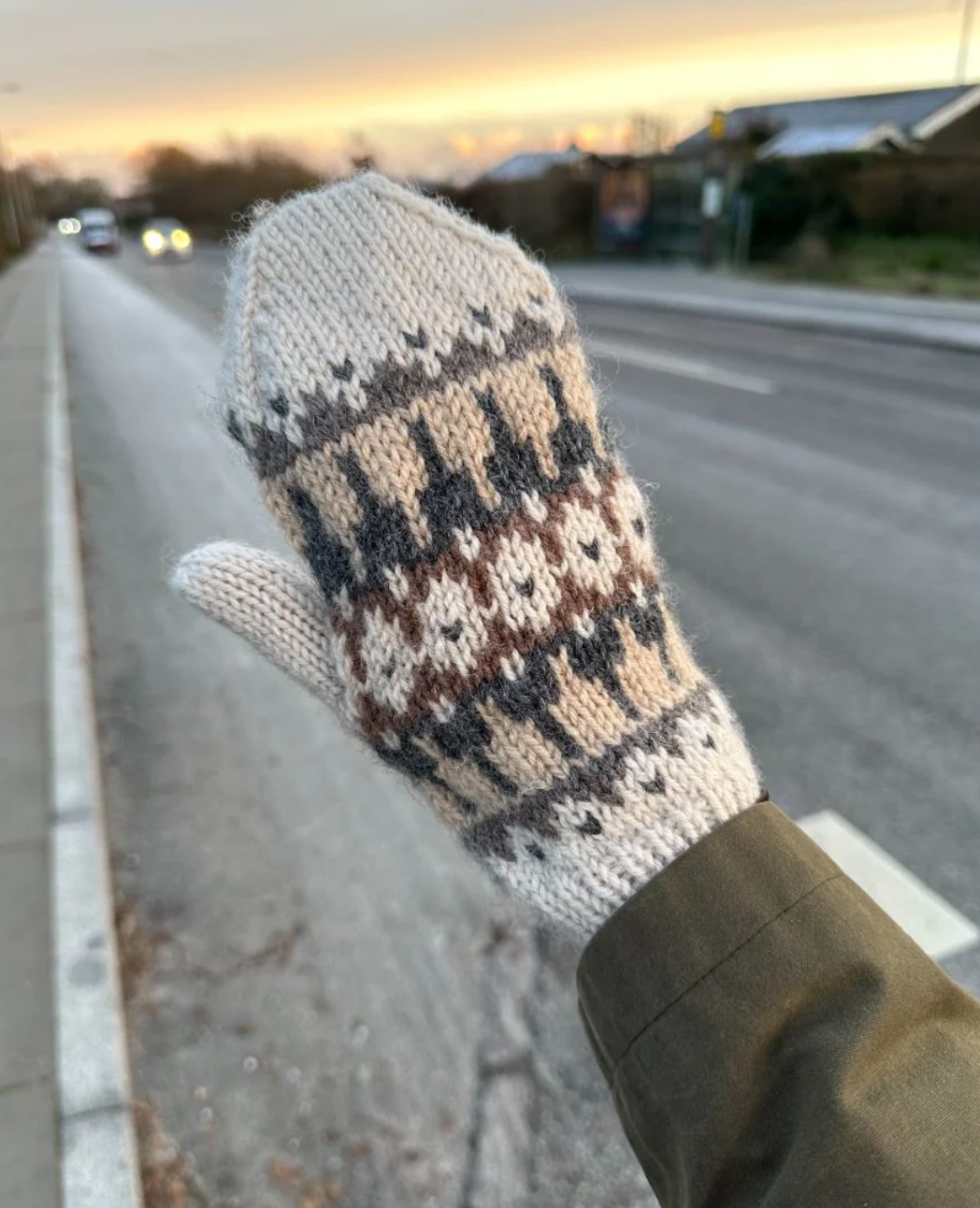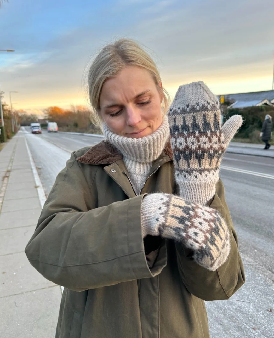 De lyse Celeste Votter er strikket i Peer Gynt fra Sandnes Garn i fargene Muskat melange [3070], Charcoal melange [1065], Mellombrun melert [2652], Shell melange [2710] og Almond [2511].