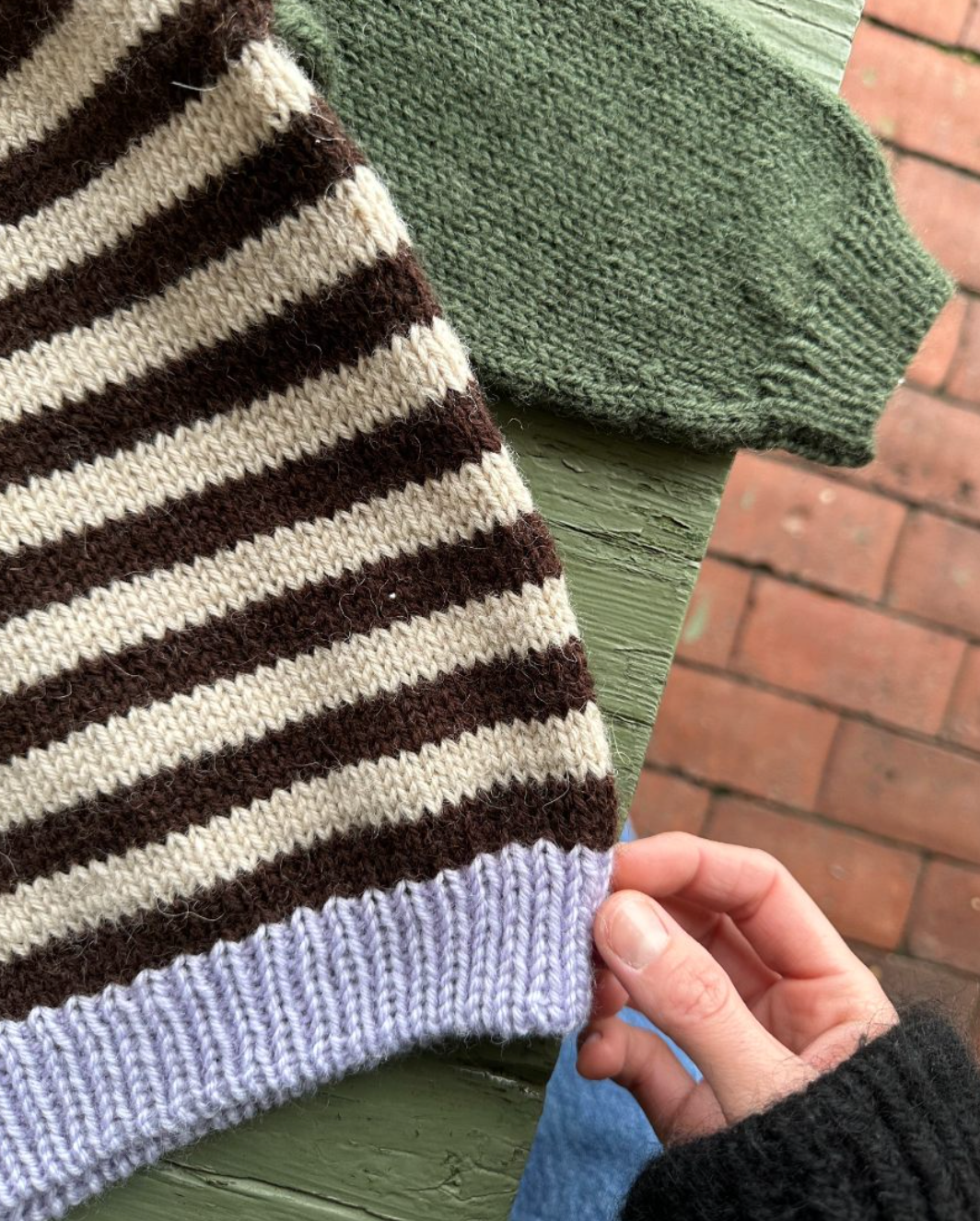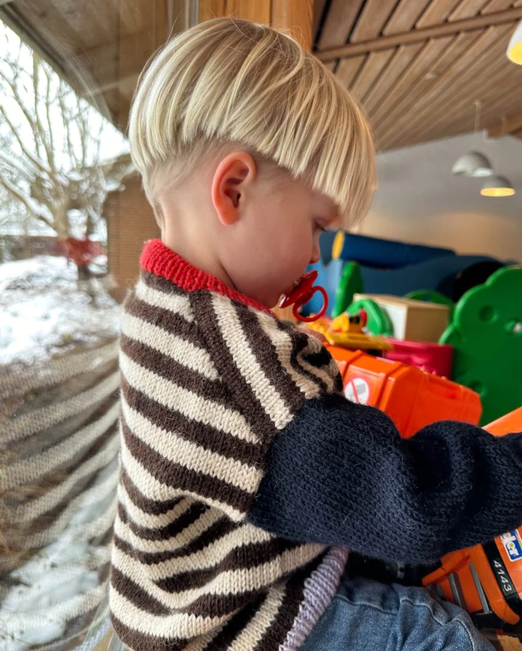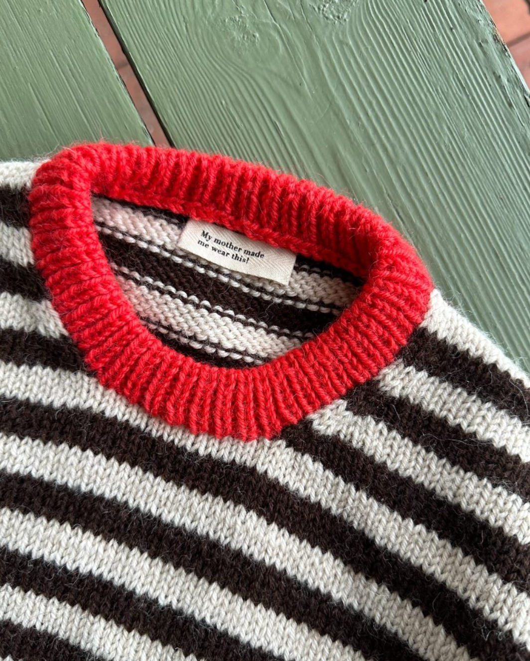 Den flerfargede Holger Sweater er strikket i Peer Gynt fra Sandnes Garn i fargene Almond [2511], Cacao nibs [3091], Pine [9581], Night sky [5591], Poppy [4008] og Perfect purple [5012].