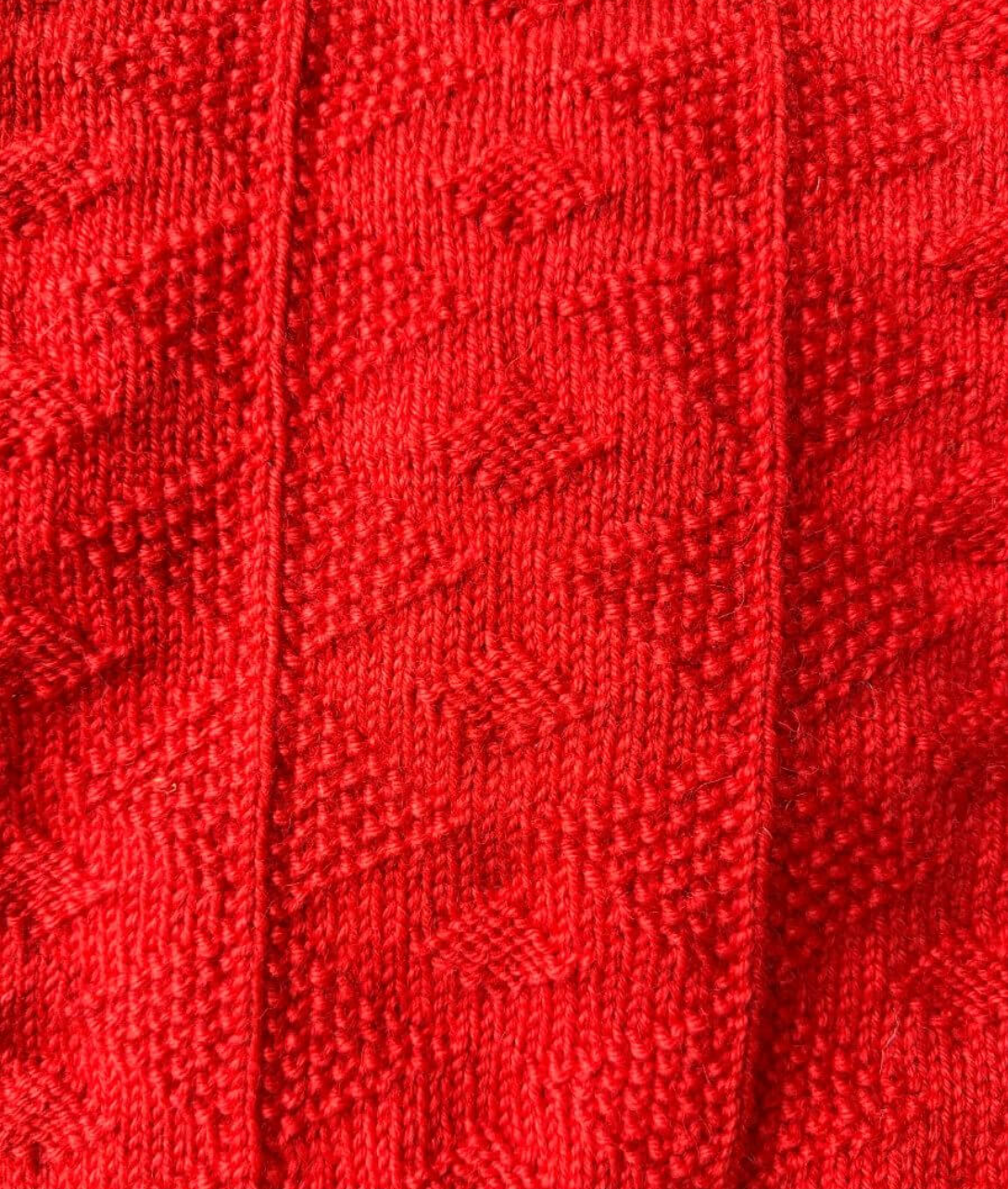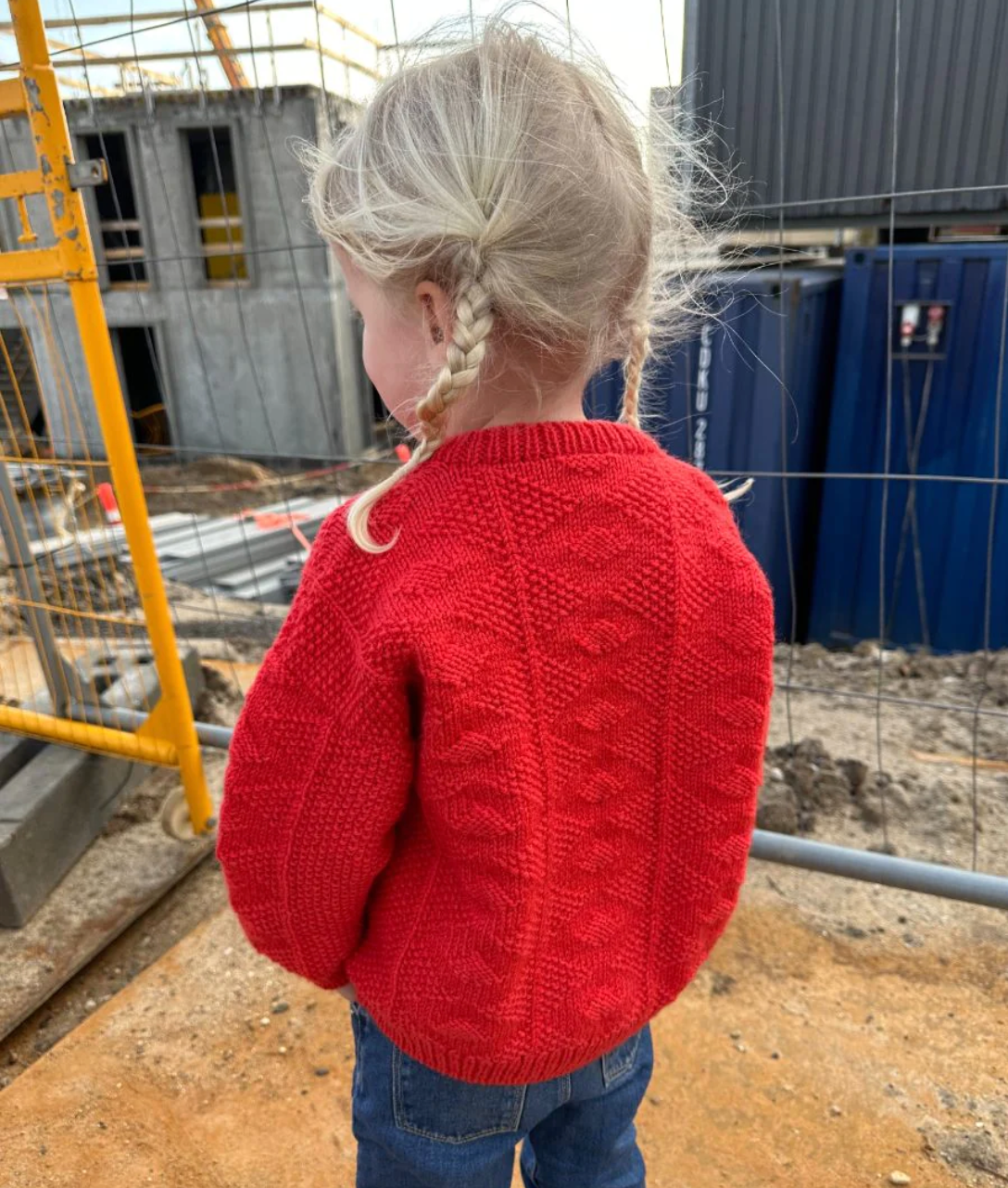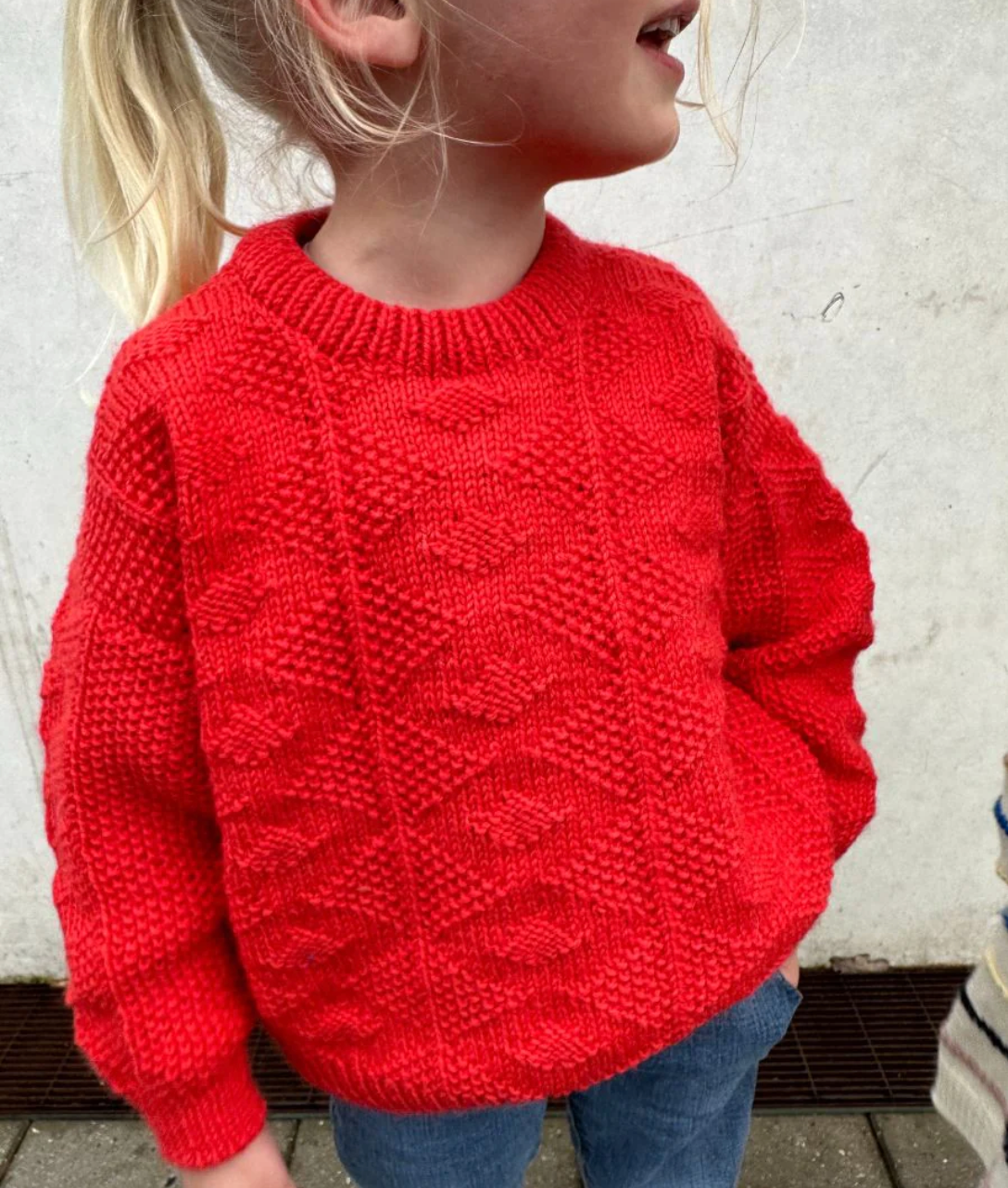 Den røde Esther Sweater Junior er strikket i Peer Gynt fra Sandnes Garn i fargen Poppy [4008].