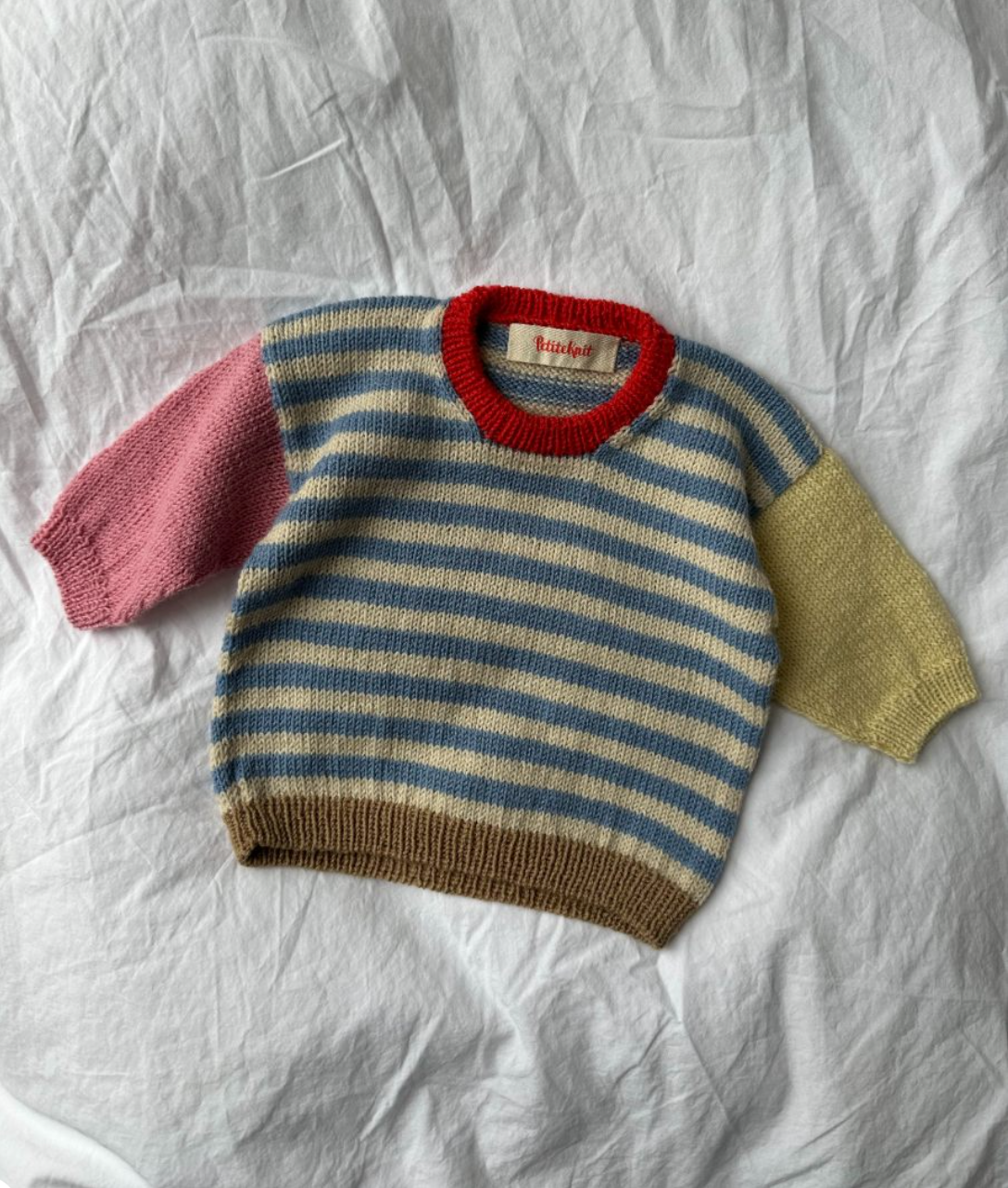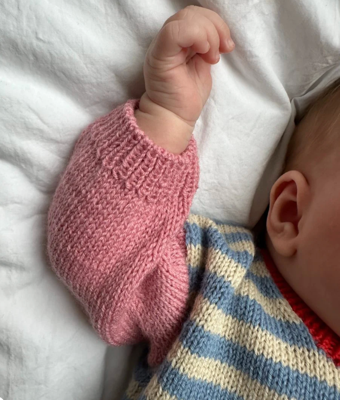 Den flerfargede Holger Baby Set er strikket i Sunday fra Sandnes Garn i farverne Almond [2511], Baby blue eyes [6043], Banana [2114], Plastic pink [4304], Poppy [4008] og Camel [2542].