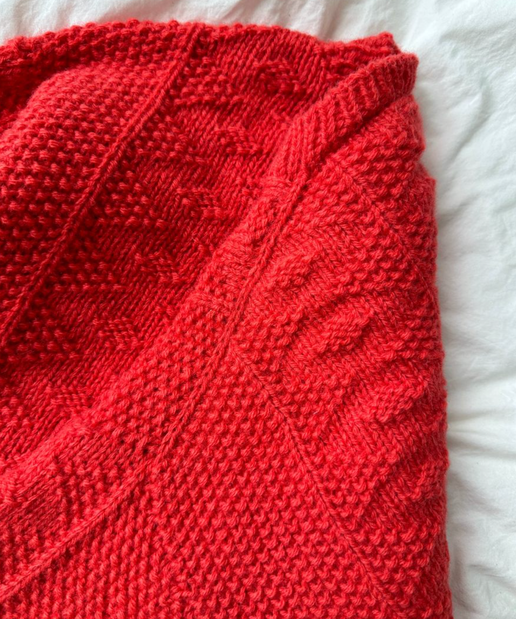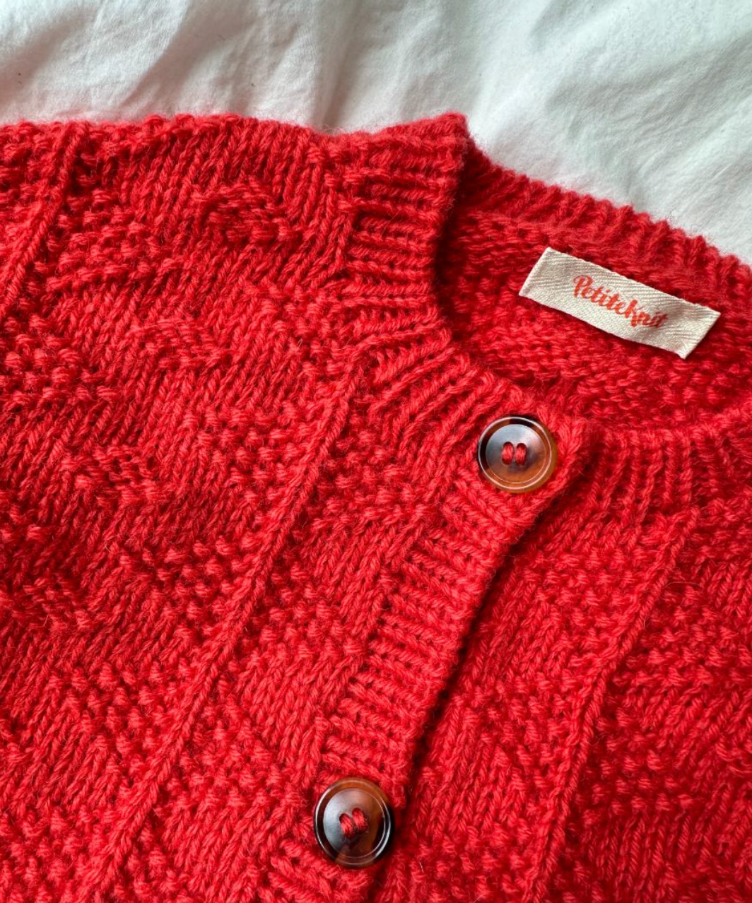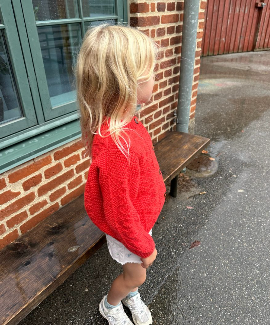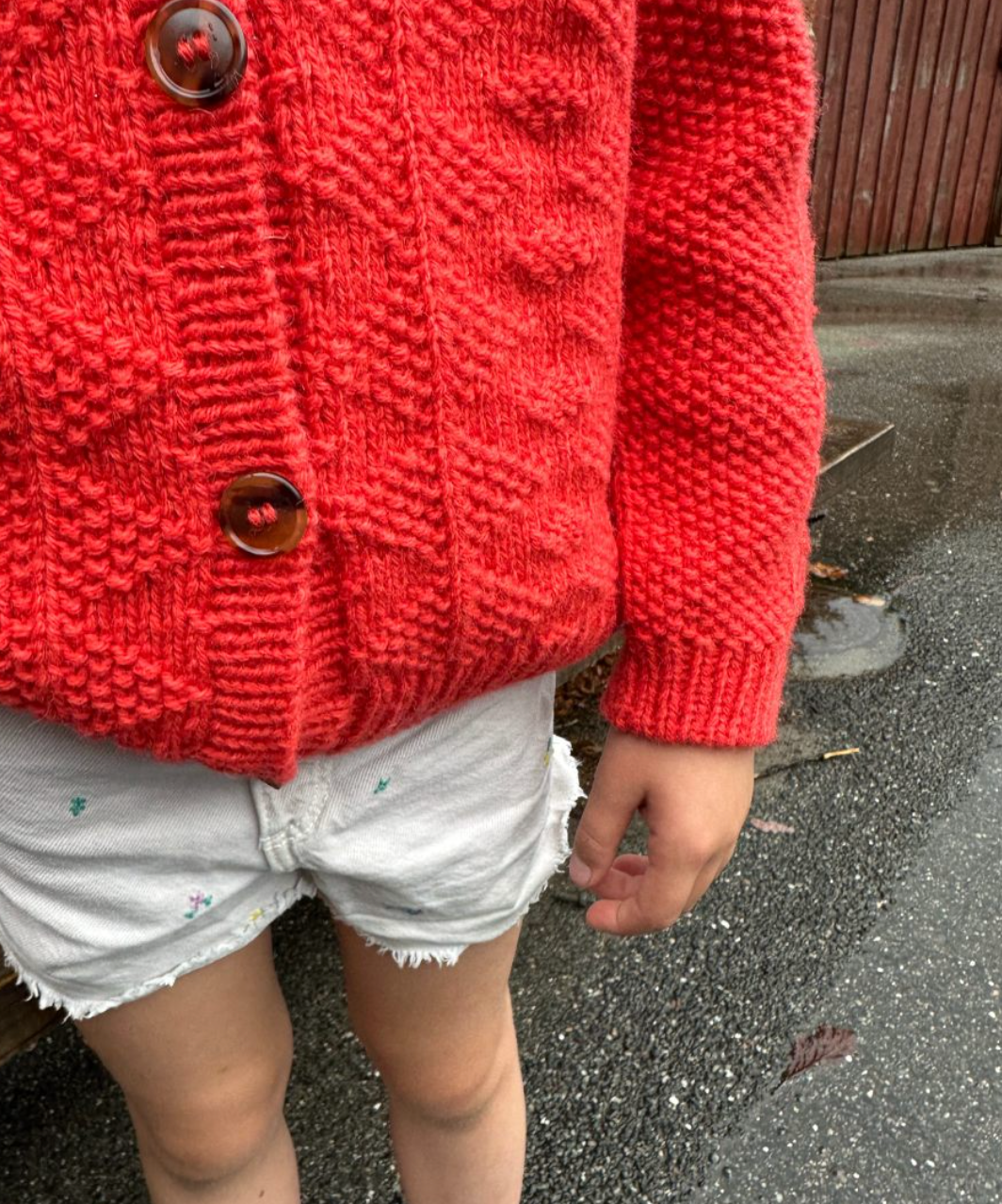 Den røde Little Esther Jacket er strikket i Jensen Yarn fra Isager i farge 28 sammen med Tvinni fra Isager i farge 28.