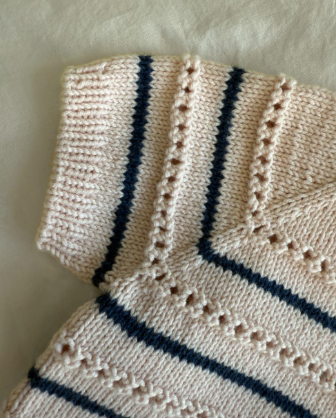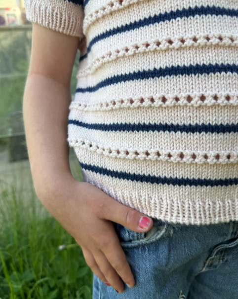 Ida Tee Junior strikkes ovenfra og ned med et mønster av strukturstrikk og striper. Først strikkes det frem og tilbake på pinnen for å danne halsutskjæringen, og deretter samles arbeidet, slik at resten av bærestykket kan strikkes rundt på rundpinnen med raglanøkninger. Langs halsåpningen plukkes det opp masker, og det strikkes en halskant i vrangbord.
