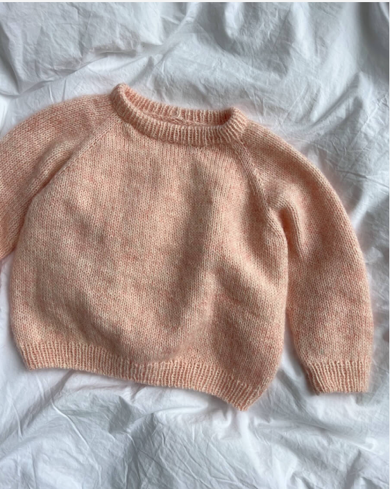 Den lyserøde Monday Sweater Junior er strikket i Sunday fra Sandnes Garn i fargen Hvit [1001] sammen med Tynn Silk Mohair fra Sandnes Garn i fargen Ferskenblomst [4033]