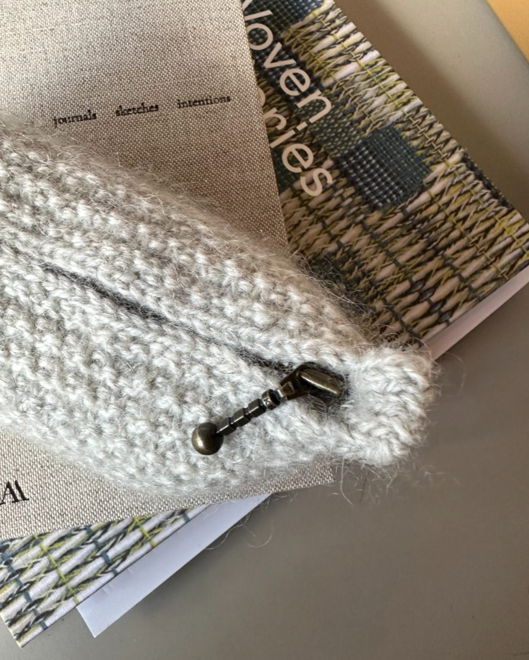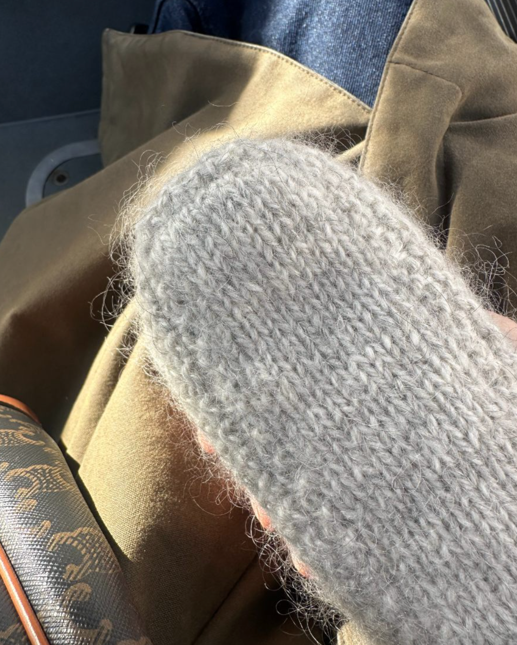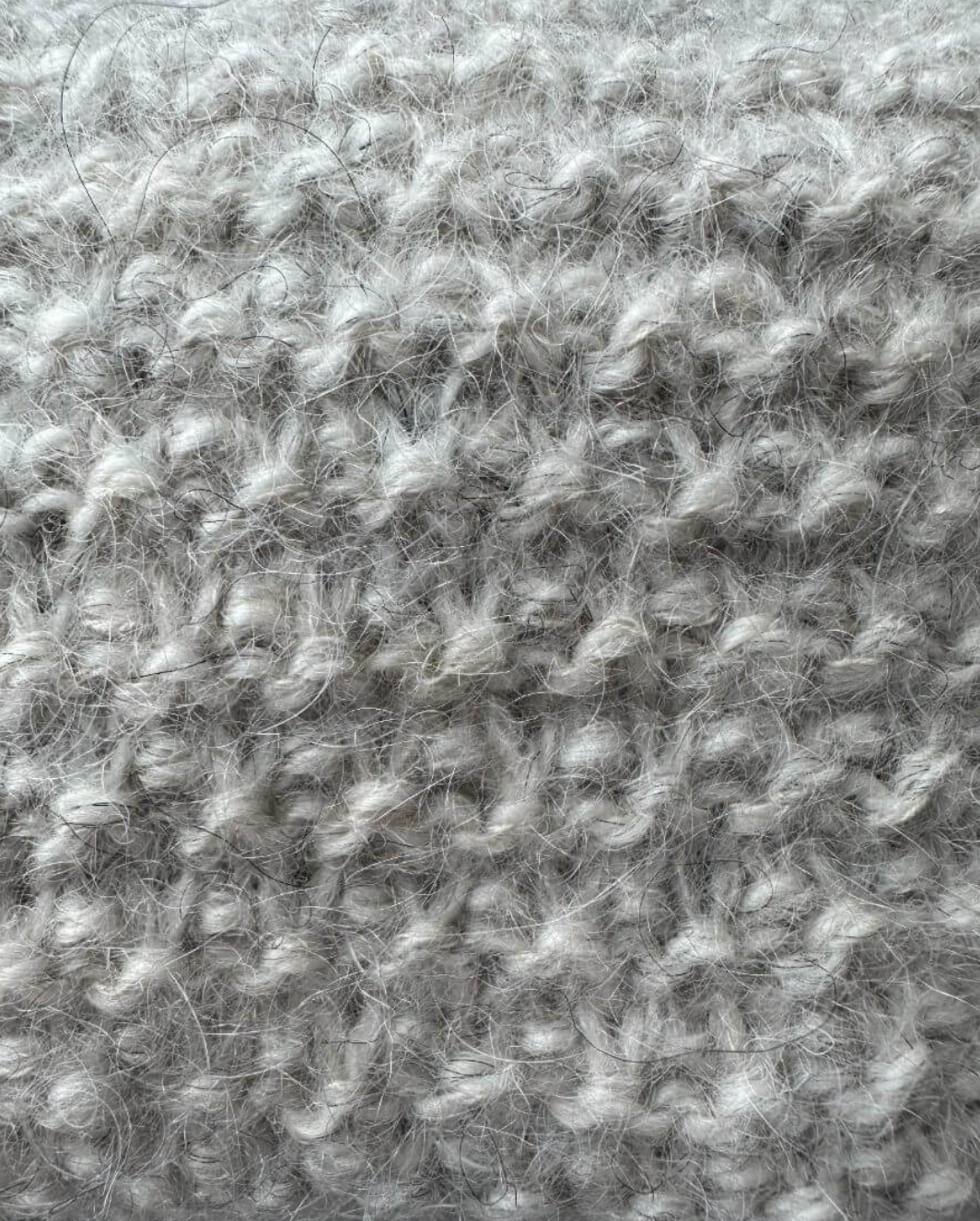 Den grå Marie Case er strikket i Pelsuld 5,5/2 fra Hjelholts Uldspinderi i fargen Sand [04] sammen med Silk Mohair fra Isager i farge 2S.