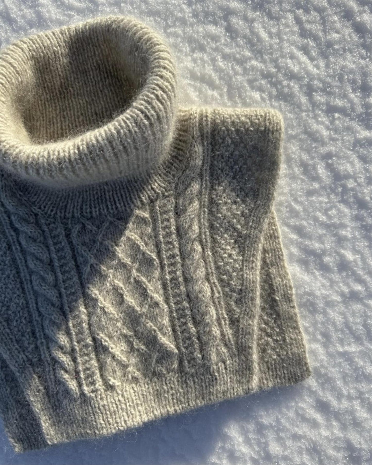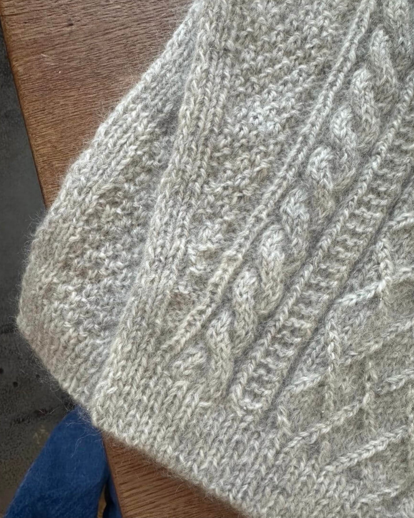 Den grå Moby Neck er strikket i Pelsuld 5,5/2 fra Hjelholts Uldspinderi i fargen Sand [04] sammen med Silk Mohair fra Isager i farge 2S.