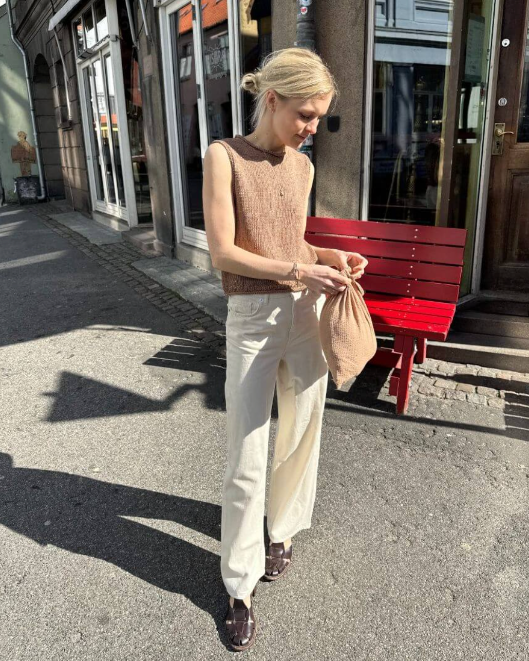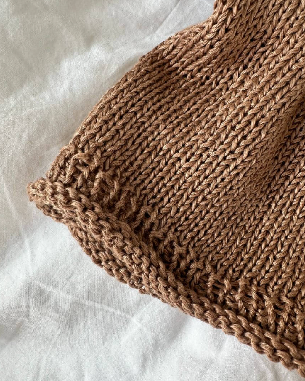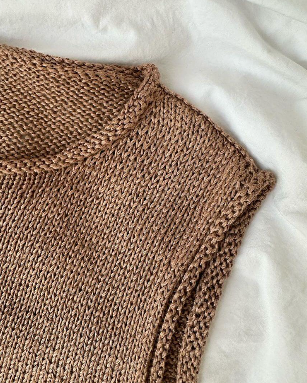Den brune Cloud Top er strikket i Hør Organic fra Isager i fargen Camel.