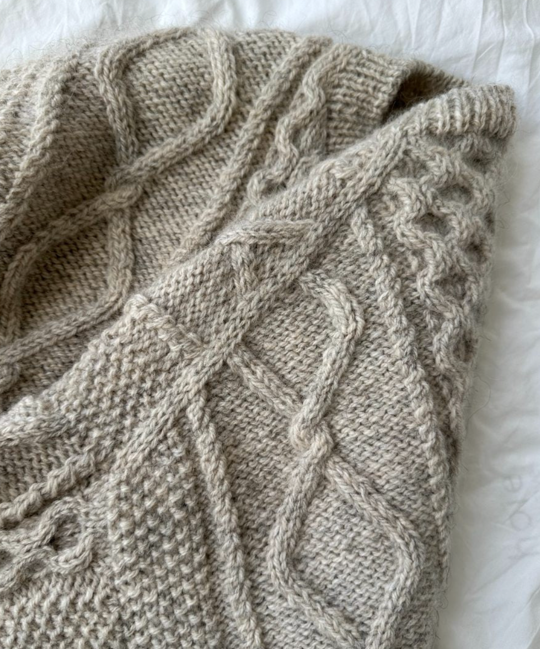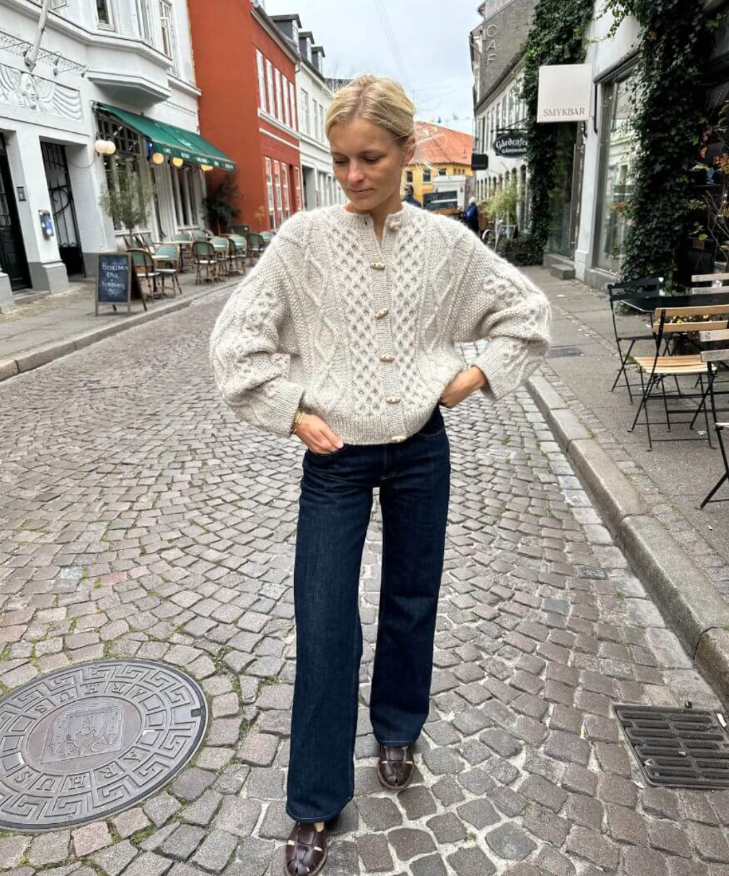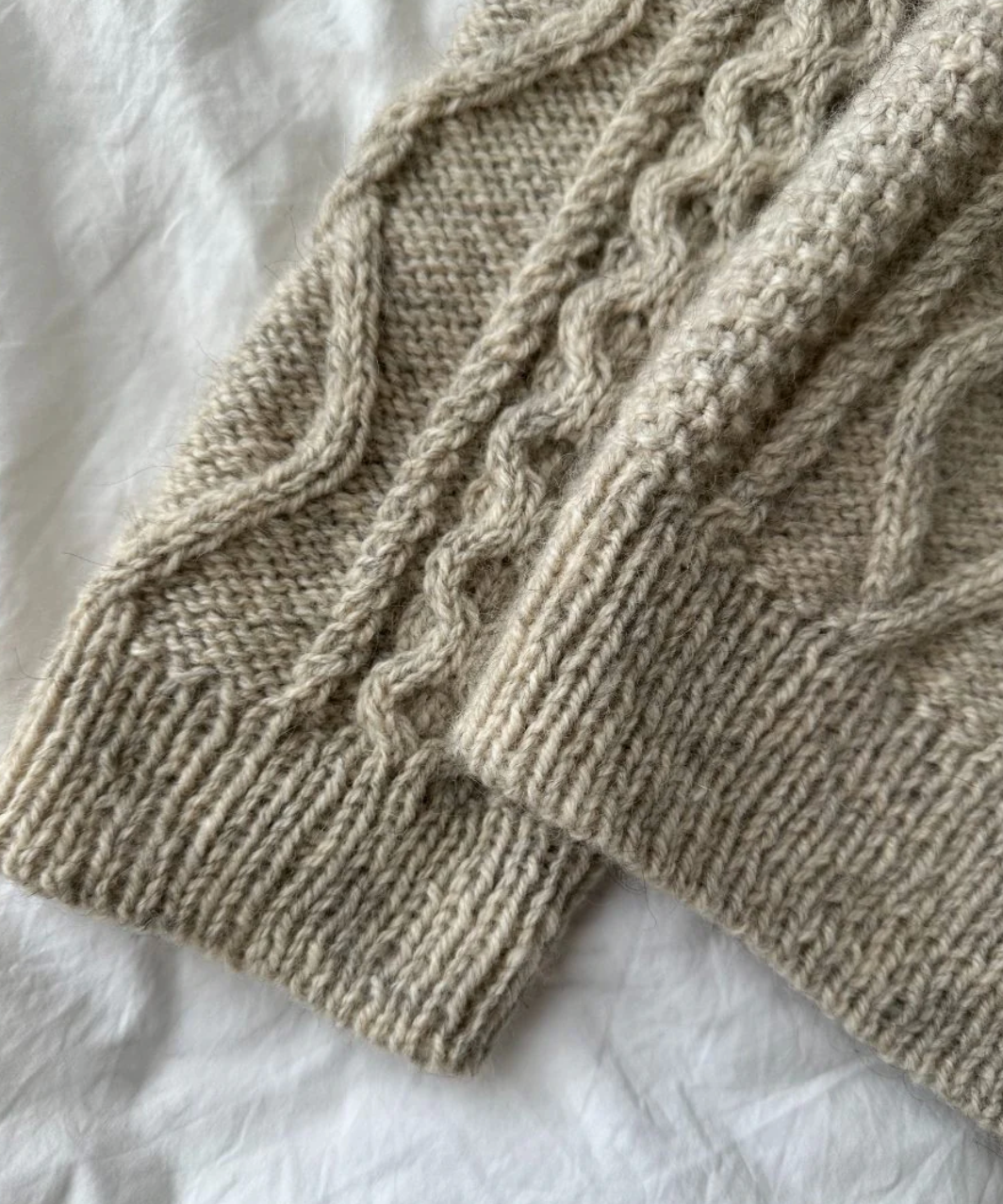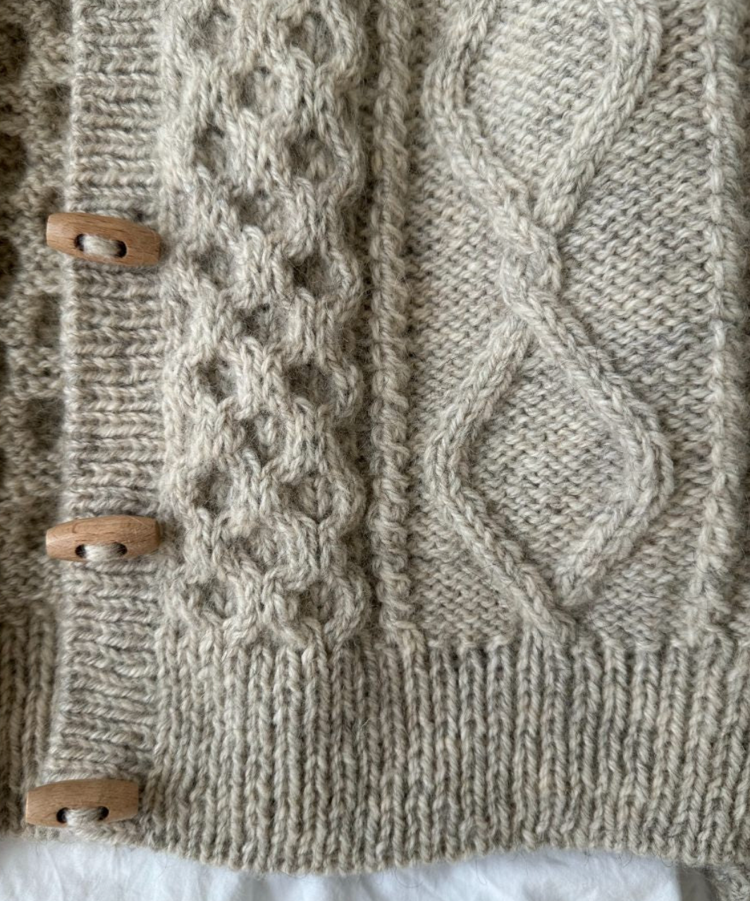 Den grå Dagmar Jacket er strikket i Hjelholt Triple fra Hjelholts Uldspinderi i fargen Creme [42].