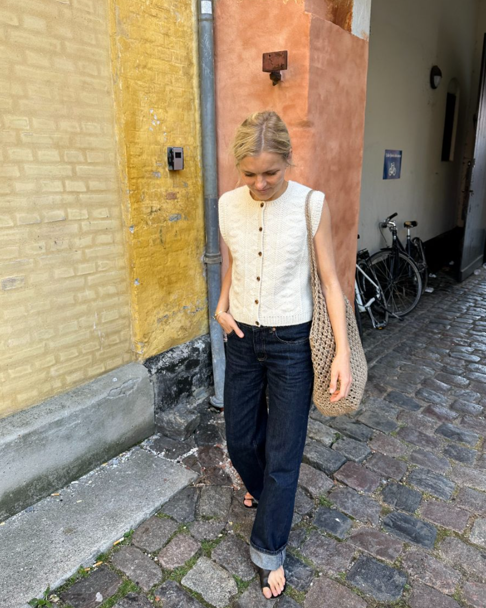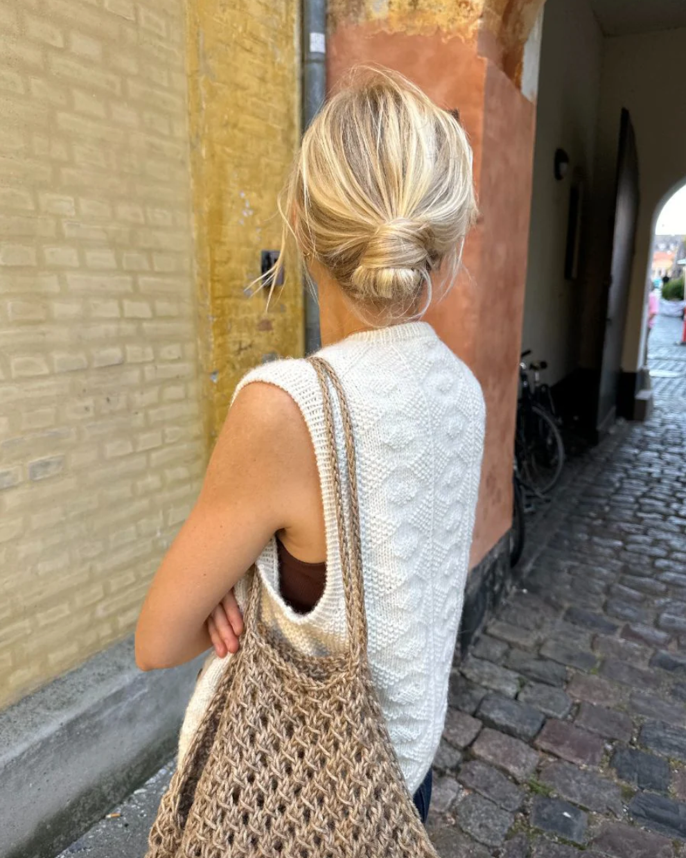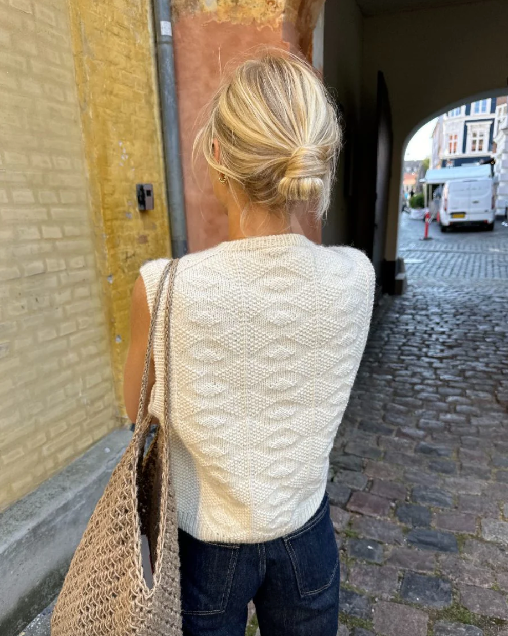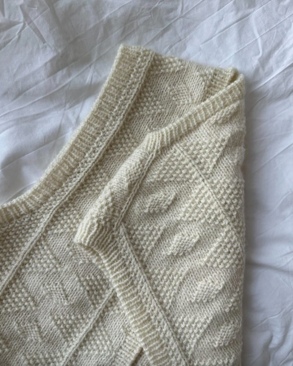 Den hvite Esther Vest er strikket i Jensen Yarn fra Isager i farge 0 sammen med Spinni fra Isager i farge 0.