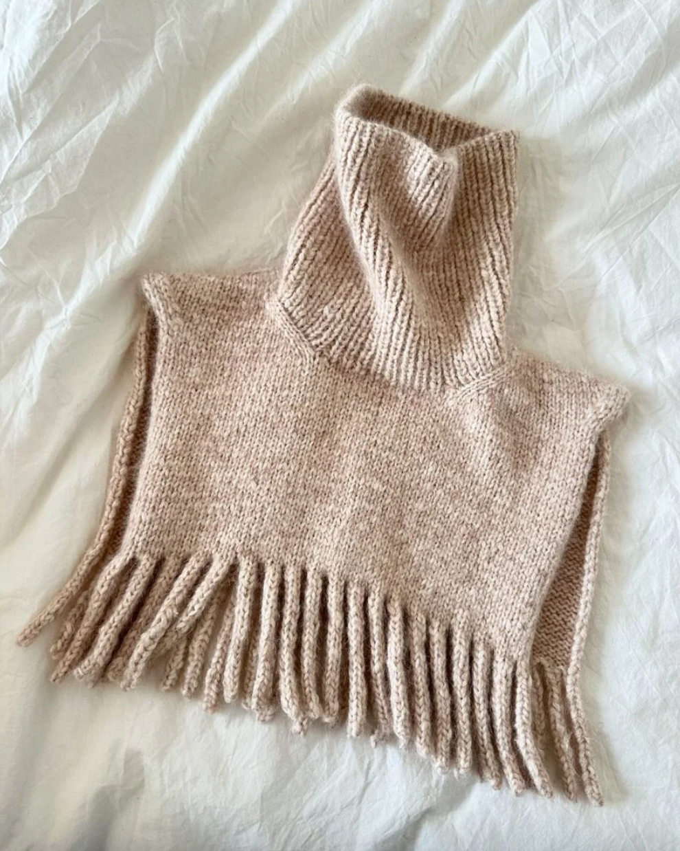 Den beige Nora Neck er strikket i Snefnug fra CaMaRose i fargen Lys beige [7314] sammen med Silk Mohair fra Isager i farge 6.