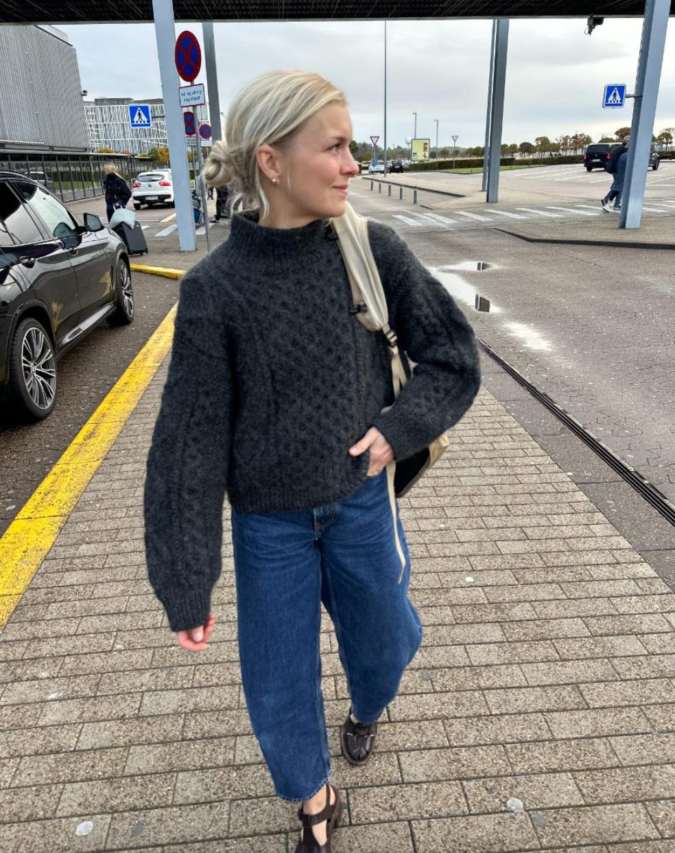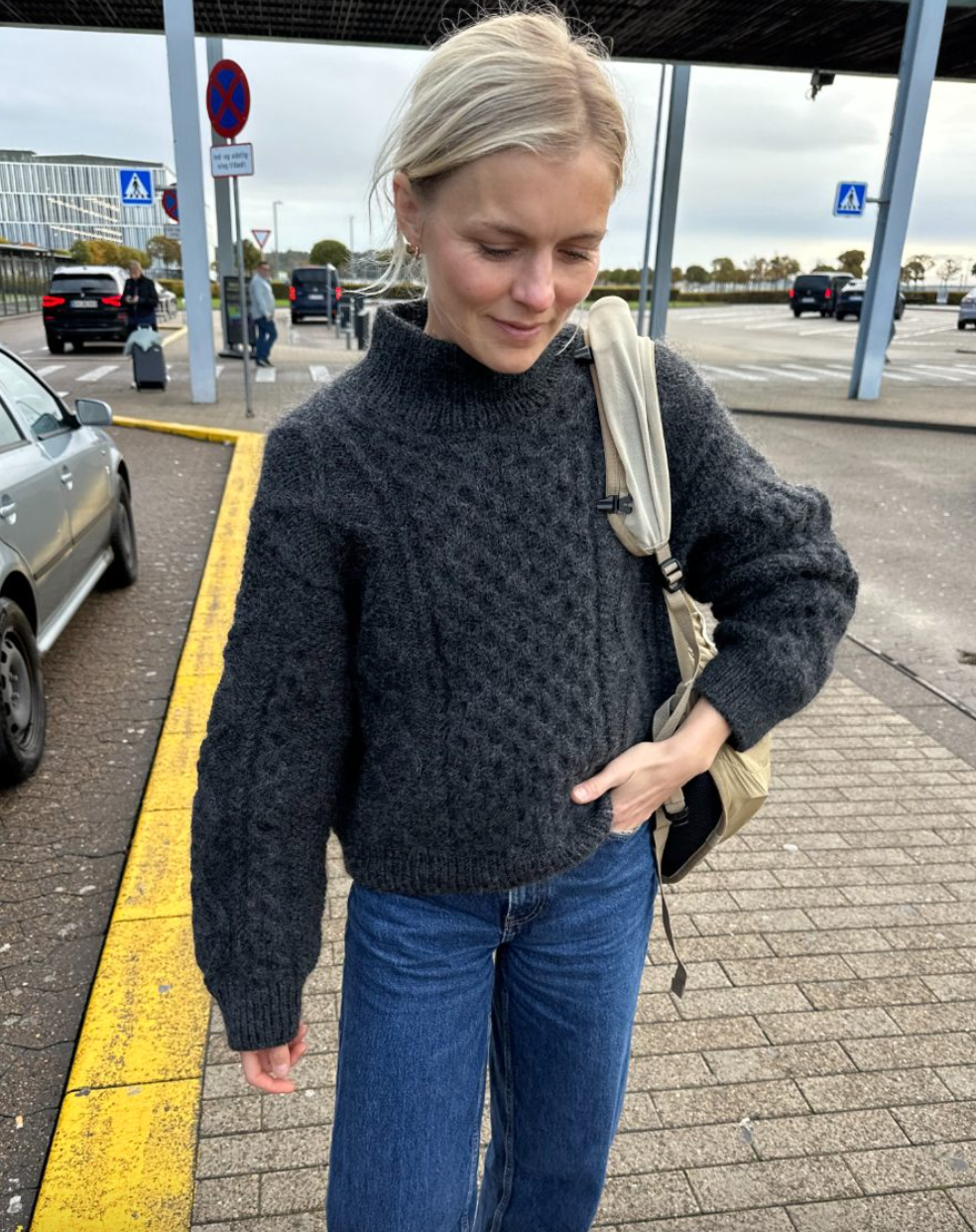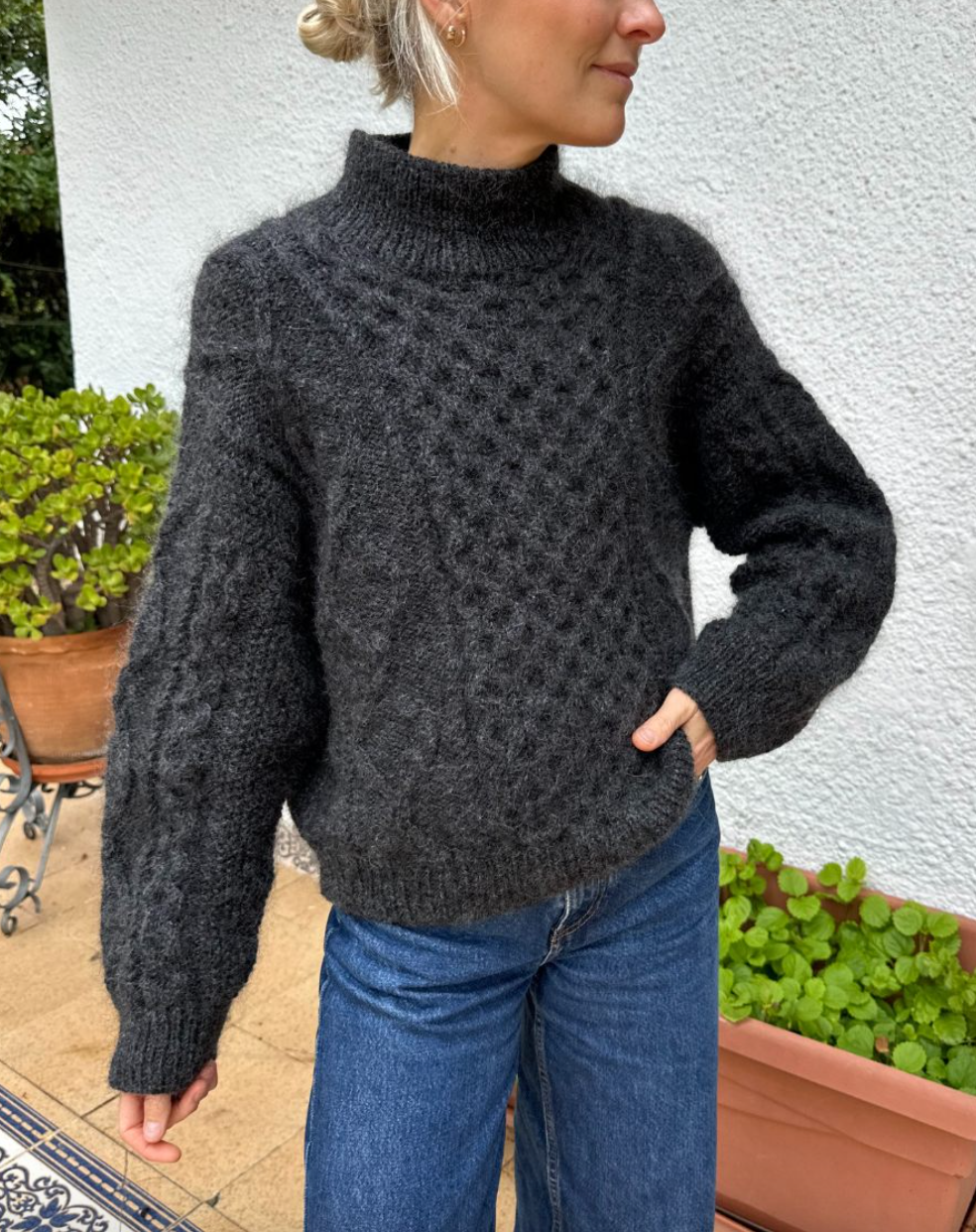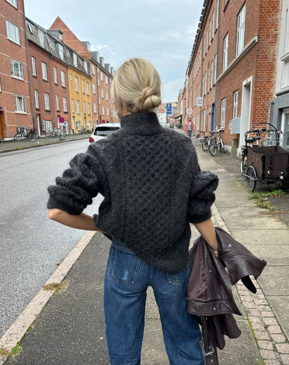 Den grå Dagmar Sweater er strikket i Hjelholt Triple fra Hjelholts Uldspinderi i fargen Charcoal [44].