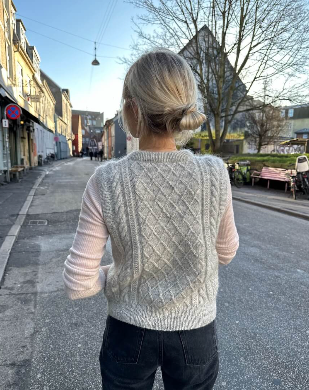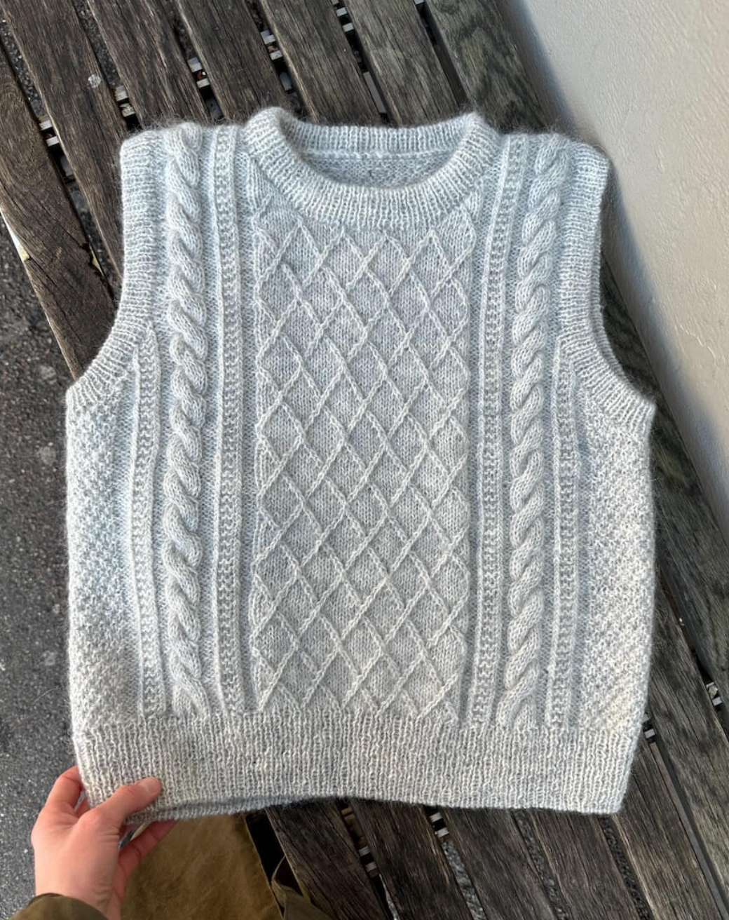 Forslag 2: 150 (150) 150 (200) 200-250 (250) 250 (250-300) 300 g Tvinni fra Isager Yarn (50 g = 255 m) eller 200 (200) 200 (250) 250-300 (300) 300-350 (350) 350 g Tynn Peer Gynt fra Sandnes Garn (50 g = 205 m) strikkes sammen med 100 (100) 100 (125) 125-150 (150) 150 (150-175) 175 g Silk Mohair fra Isager Yarn (25 g = 212 m) eller Soft Silk Mohair fra Knitting for Olive (25 g = 225 m) eller Tynn Silk Mohair fra Sandnes Garn (25 g = 212 m)