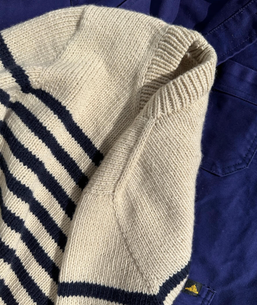 Den hvite og blå Lyon Sweater er strikket i Sunday fra Sandnes Garn i fargene Almond [2511] og Night sky [5591].