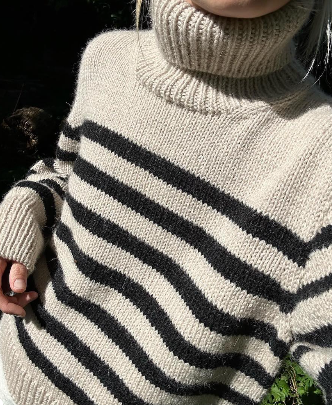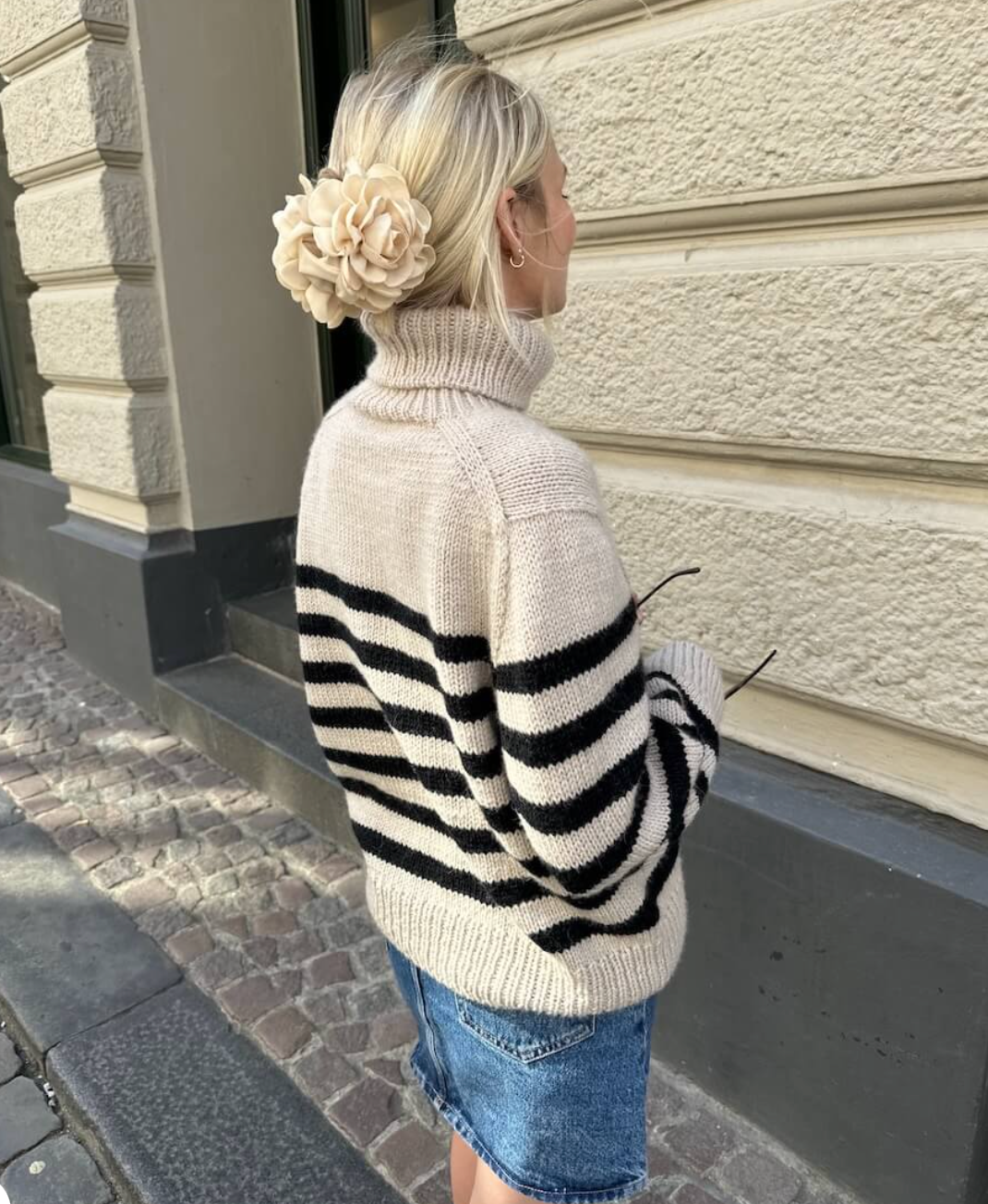 Den hvite og sorte Lyon Sweater - Chunky Edition er strikket i Peer Gynt fra Sandnes Garn i fargen Marsipan [2321] sammen med Alpakka Følgetråd fra Sandnes Garn i fargen Marsipan [2321] og Peer Gynt fra Sandnes Garn i fargen Svart [1099] sammen med Alpakka Følgetråd fra Sandnes Garn i fargen Sort [1099].