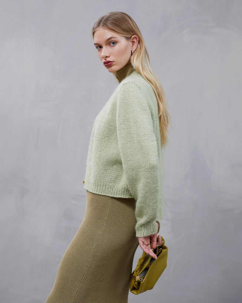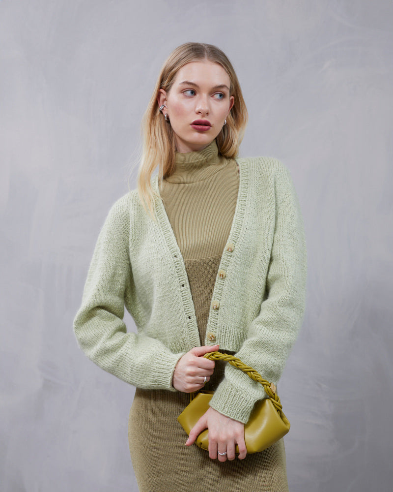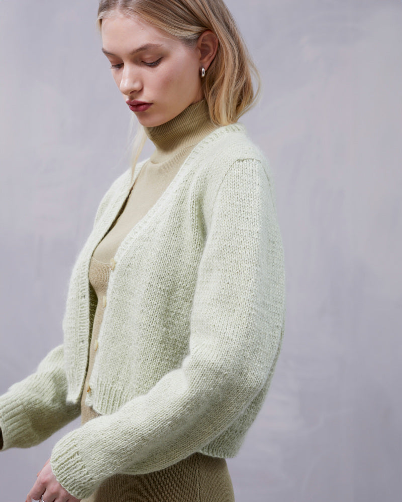 Malva jakke er en glattstrikket, v-halsjakke med en kort og elegant passform. Jakken ser ut som den har isatte ermer, men hele skulderkonstruksjonen strikkes i ett – alá en avansert raglanøkning. Jakken strikkes ovenfra og ned. Først strikkes bakstykket med skrå skuldre. Så plukkes m opp langs skuldrene, og forstykkene strikkes på samme måte. Videre settes alt på samme pinne samtidig som man strikker opp masker til ermetoppene langs hver side av arbeidet. Man fortsetter over alle maskene samtidig som man først øker masker til ermene og videre til både bol og ermer samtidig. Samtidig øker man også til v-hals. Når økningene er ferdig, deles arbeidet og ermer og bol strikkes videre hver for seg og avsluttes med en ribbekant. Bolen har fellinger i hver side slik att jakken blir smalere mot livet. Til slutt strikkes det opp m langs hele utringningen og forkantene, og kanten strikkes med knapphull.