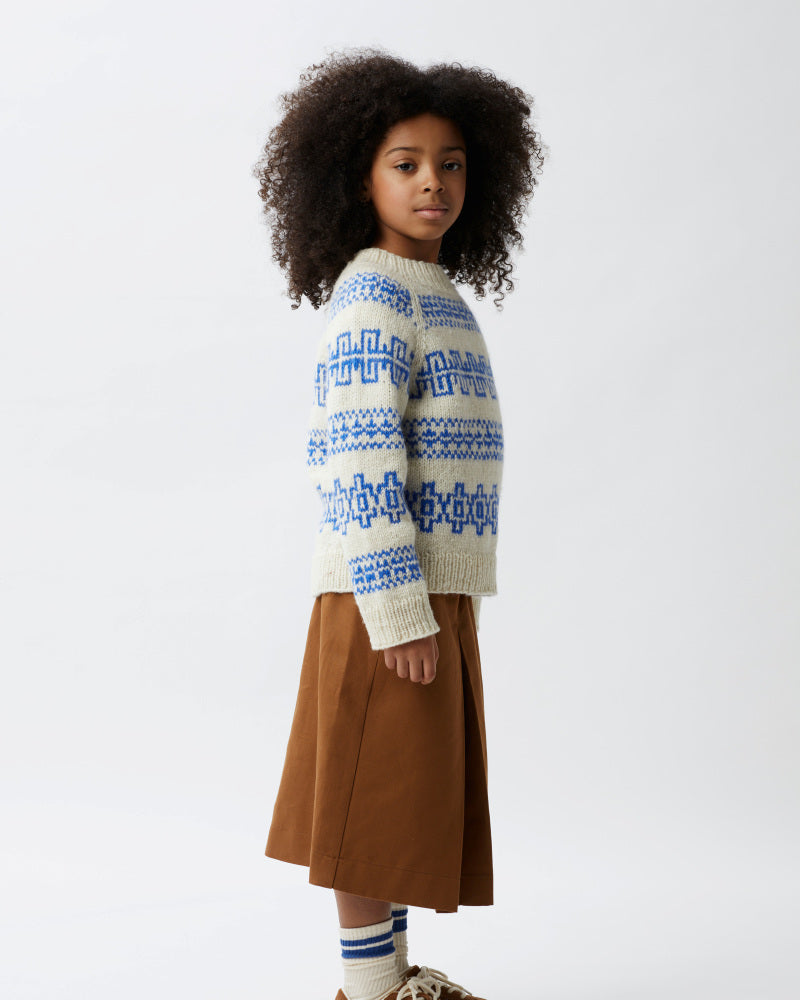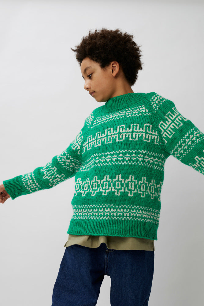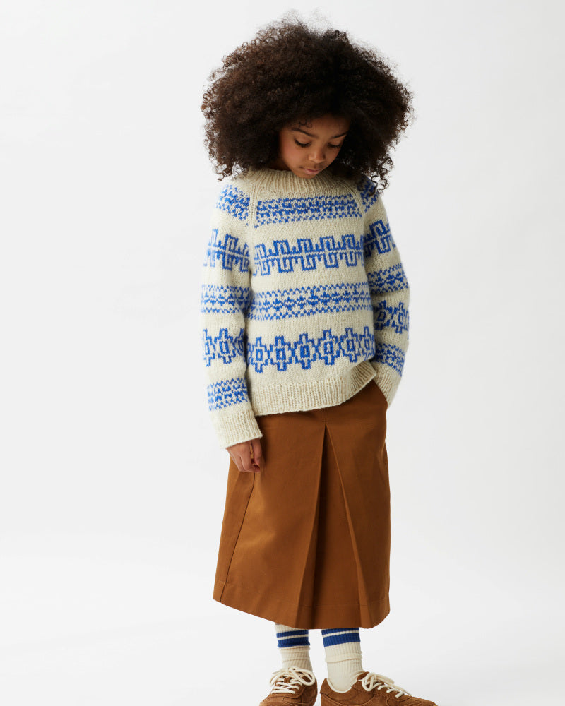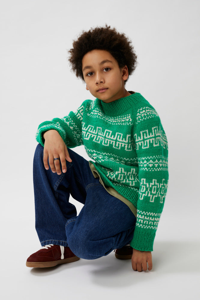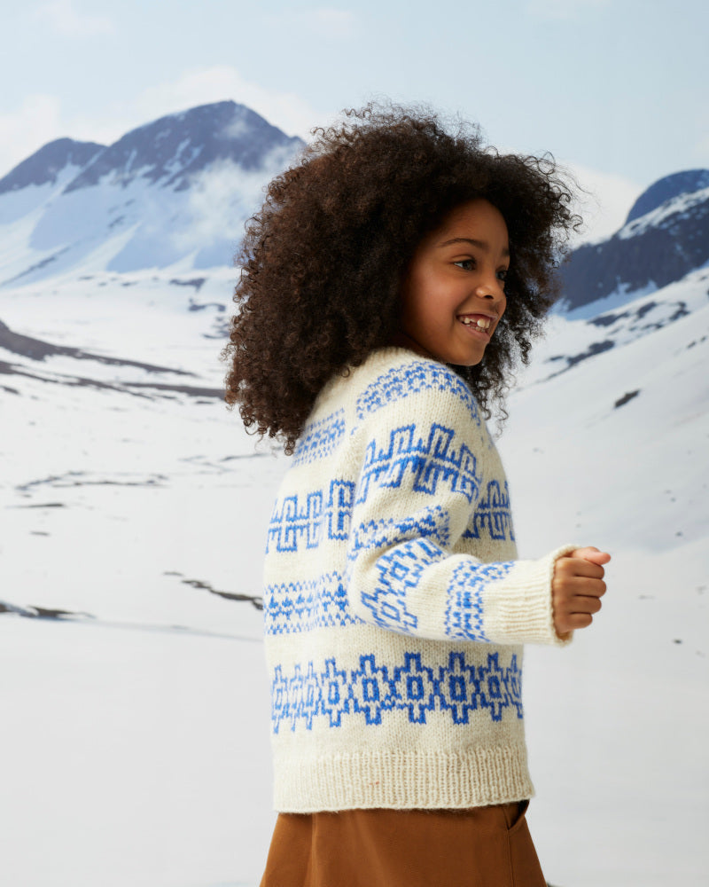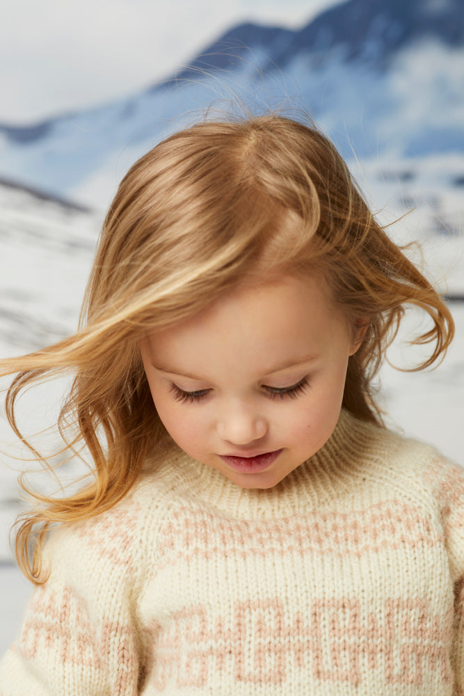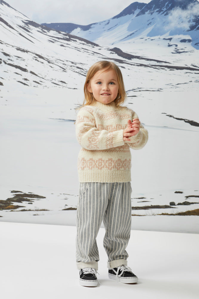Fjære genser er mønstret i to farger. Den har en avslappet passform med raglan, rund hals og ribbestrikkede kanter. Genseren strikkes ovenfra og ned. Halsringningen formes ved å strikke vendepinner, og det økes til raglan på hver side av 3 raglan-m. For å få en oversized passform, velg en størrelse som har en brystvidde som er 8-15 cm større enn barnets brystvidde.