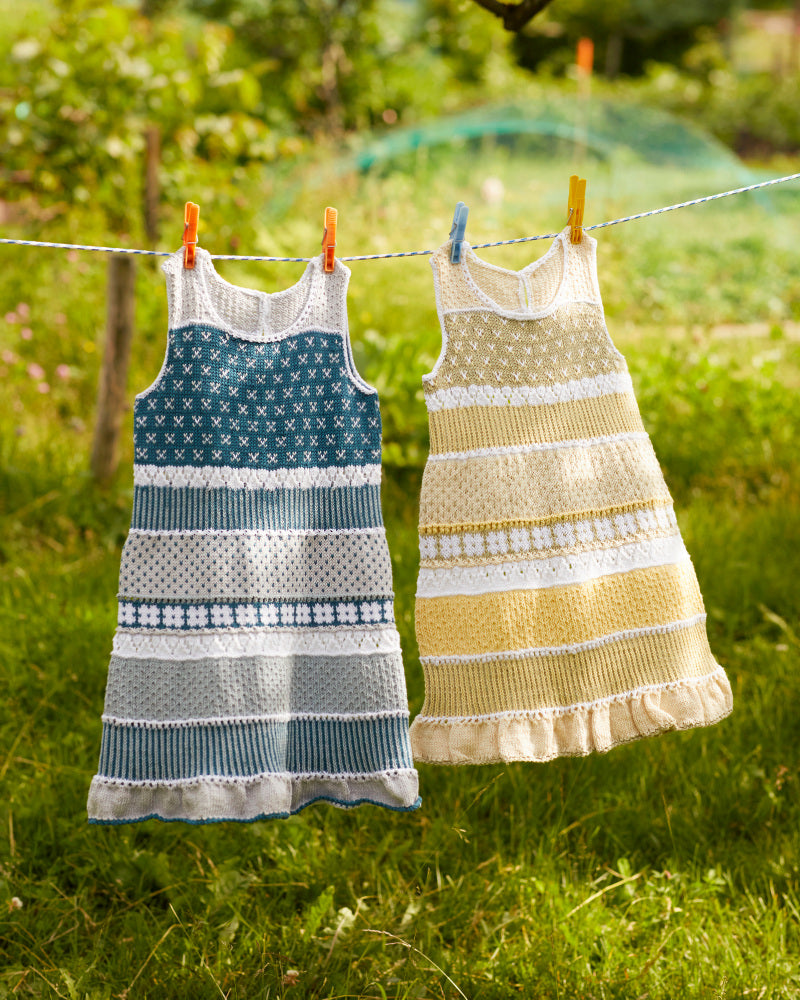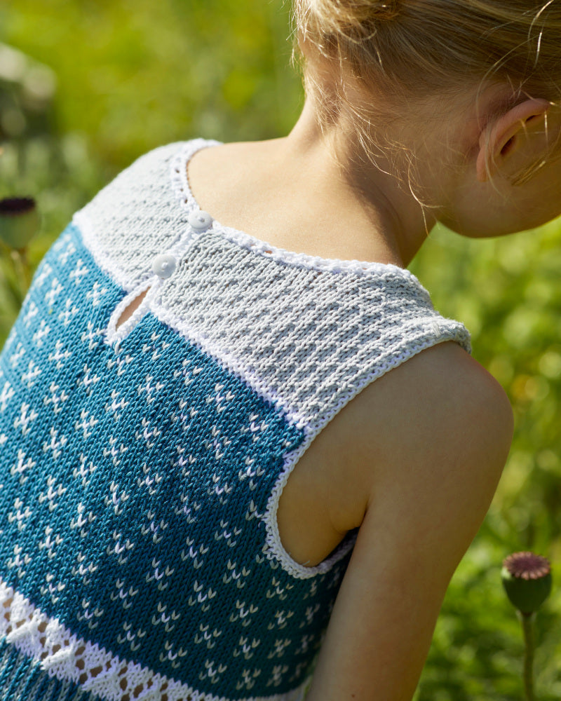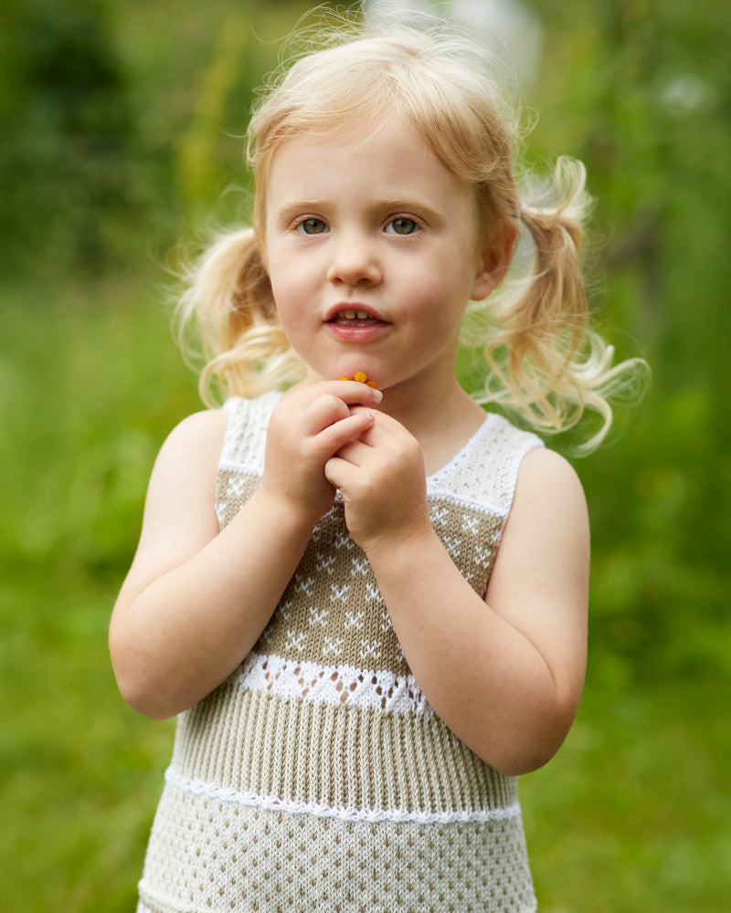 Petrinekjolen strikkes rundt nedenfra og opp til ermehullet, deretter for- og bakstykket hver del frem og tilbake for seg. Det felles til halsringning både på forstykket og bakstykket. På bakstykke deles det også midt bak til en splitt. Det plukkes opp masker rundt ermehull og halsringning. Nederst på kjolen rundt kanten hekles en kant med luftmasker og krepsemasker.
