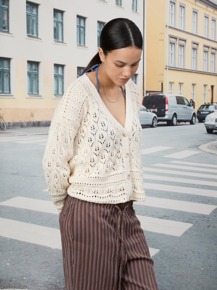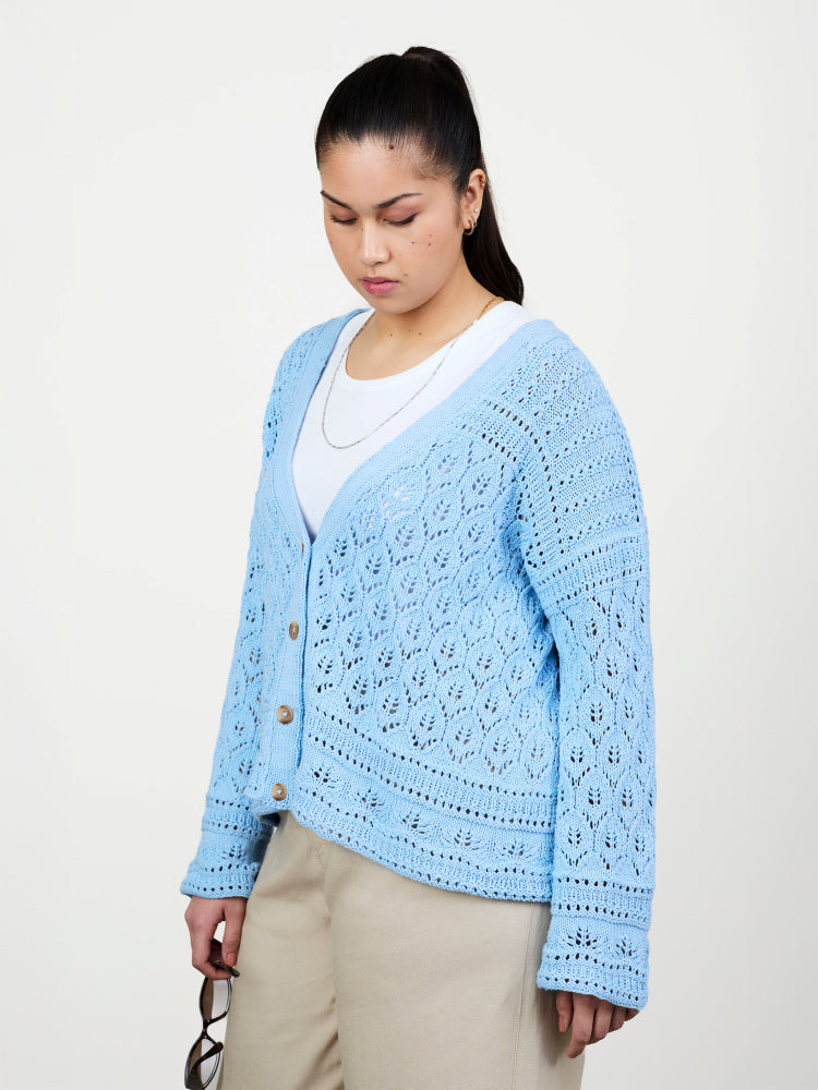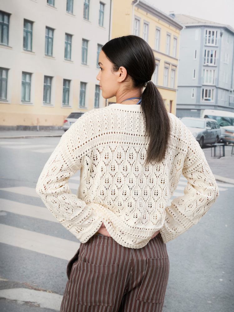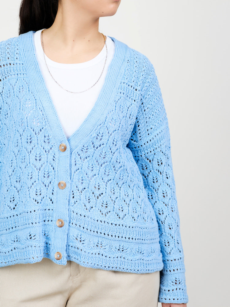 Vippajakken er en sommerlig blondejakke med border av forskjellige hullmønstre. Den har en romslig fasong med dyp v-hals og dobbelstrikket knappestolpe. Jakken strikkes nedenfra og opp etter diagram i vårt garn Petunia, laget av 100% bomull. Først strikkes bolen frem og tilbake, deretter deles arbeidet til for- og bakstykke som strikkes ferdig hver for seg. Det felles så til ermehull samtidig som v halsutringningen formes i hver forkant. Skuldrene monteres sammen med madrassting. Ermene strikkes rundt, nedenfra og opp og monteres til hvert ermehull. Til slutt plukkes det opp masker langs åpningen til knappestolpe som strikkes frem og tilbake i dobbelstrikk.