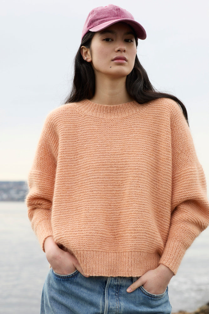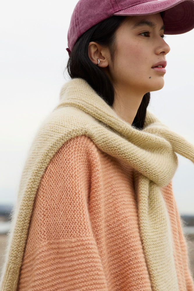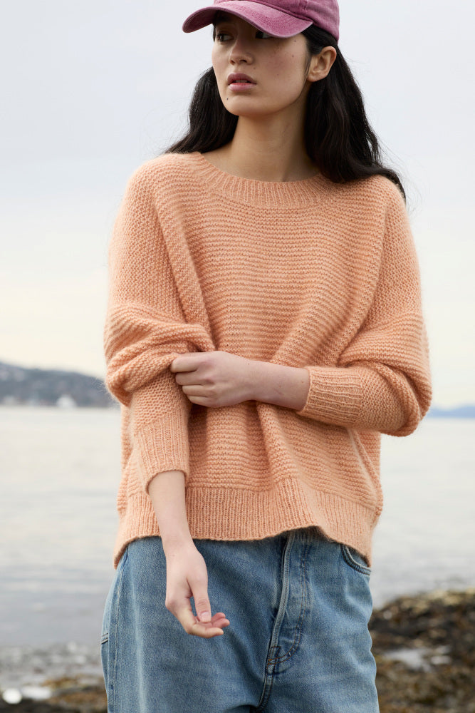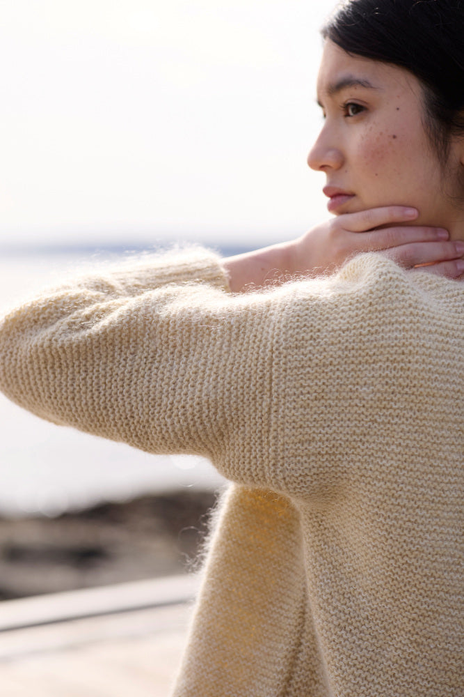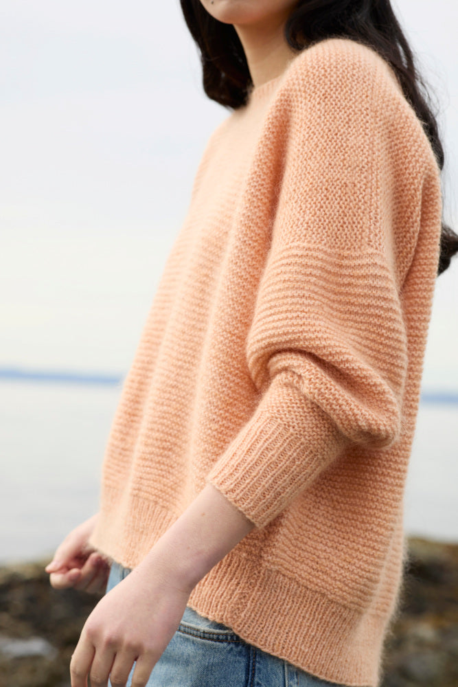 Strikkes fram og tilbake. Nedenfra og opp (Bol). Ovenfra og ned (Ermer). Rett skulder