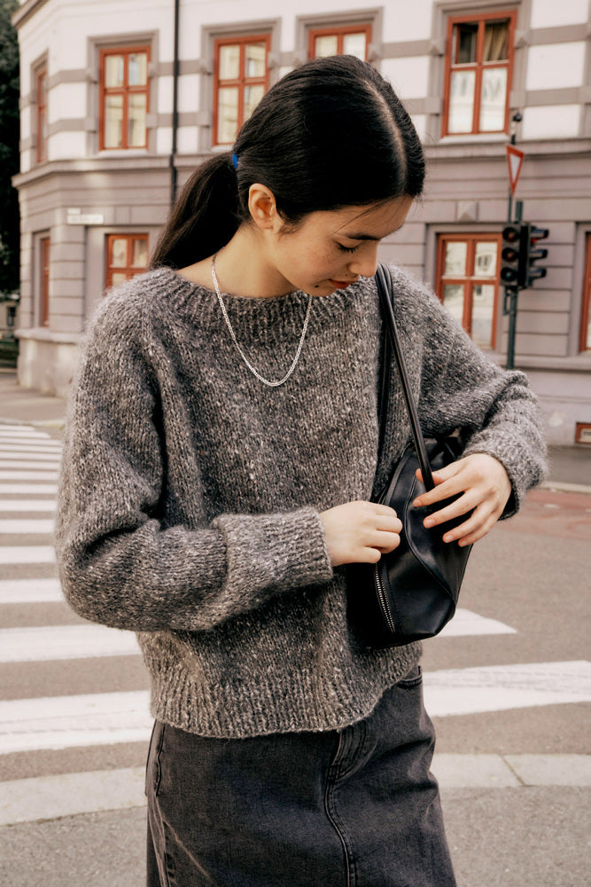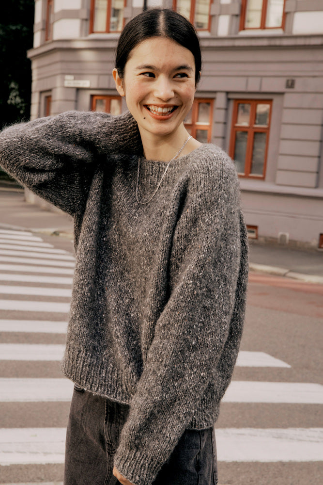 Farger brukt i den grå genseren: Dobbel tråd 21266 Tweed Mørk grå