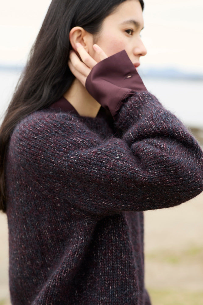 Farger brukt i den mørke genseren: 2343 Aubergine + 6557 Mørk Blå