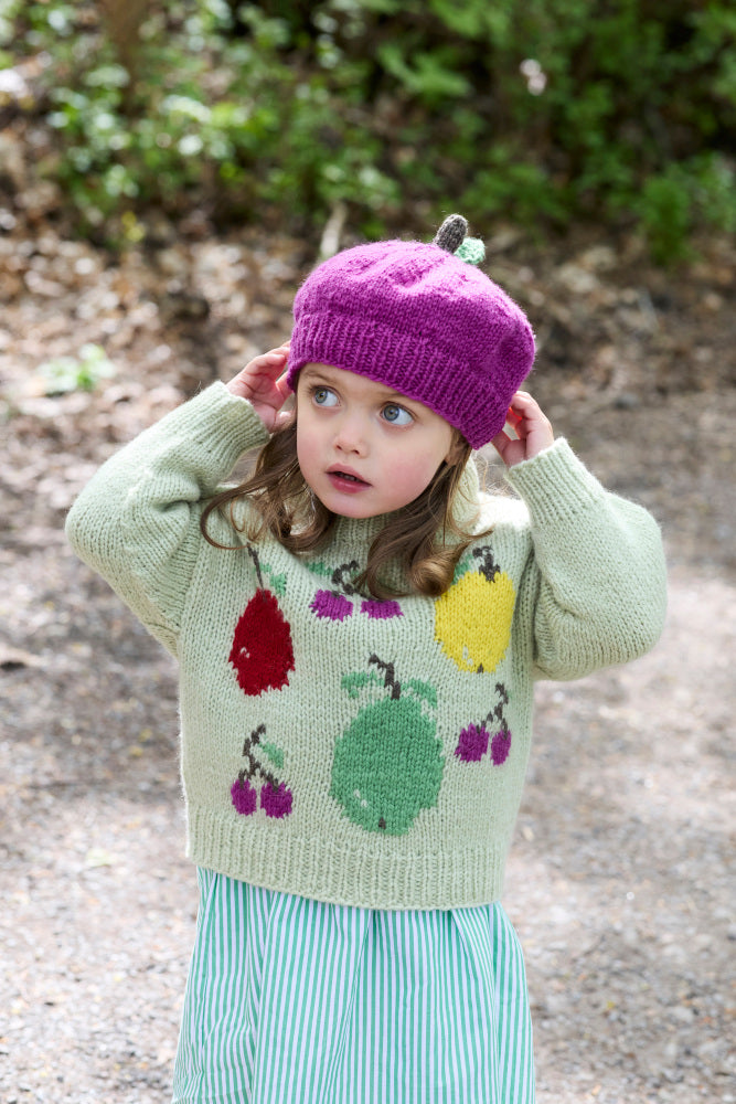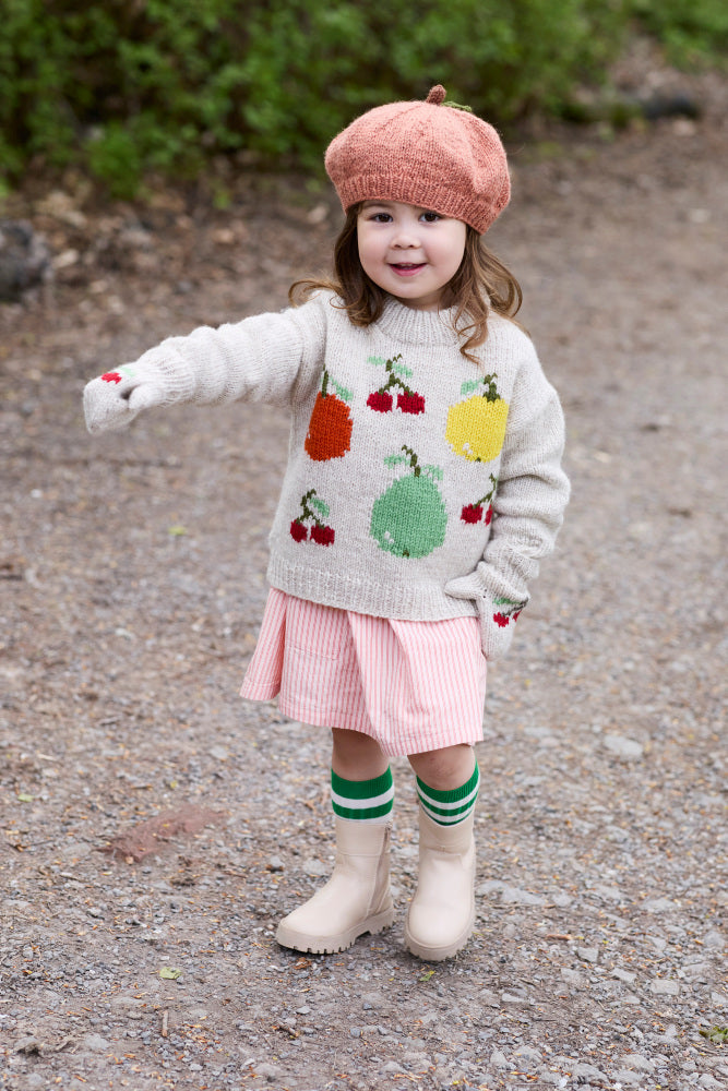 I dette heftet til barn har vi lekt oss med fruktmotiver, klare farger og intarsia som teknikk. Kanskje husker du følelsen av en favorittlue som alltid ble med ut, eller yndlingsgenseren som var med på alle eventyr. Det er nettopp der vi har har hentet inspirasjon til denne kolleksjonen - i barnelek, nysgjerrighet og årstidene som setter farge på hverdagen. Alle plaggene strikkes i vårt luftige kardegarn, Fivel. Fivel er laget av 100% norsk lamull, og gir plaggene struktur, varme og en robusthet som tåler både bruk og arv. Gled deg til en myk introduksjon til strikketeknikken intarsia, en teknikk for å lage motiver i flere farger uten trådsprang på baksiden av arbeidet.