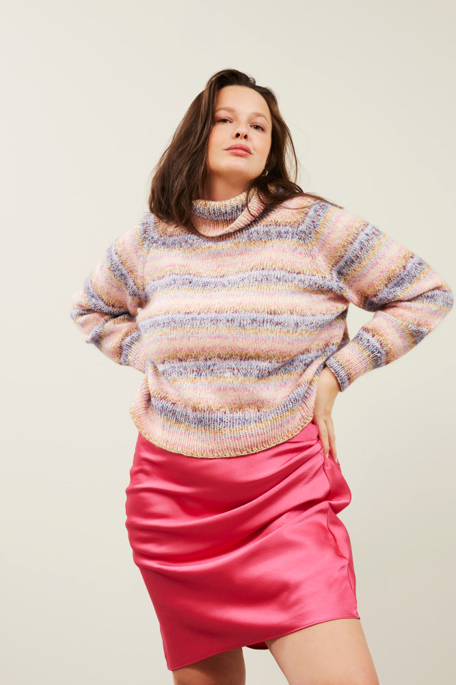 Sinse raglangenser er et eksempel på det. Den strikkes hele tiden med hvit 3-tråds Strikkegarn som bunnfarge, sammen med Plum som strikkes i et stripemønster i 7 farger. Lekkert!