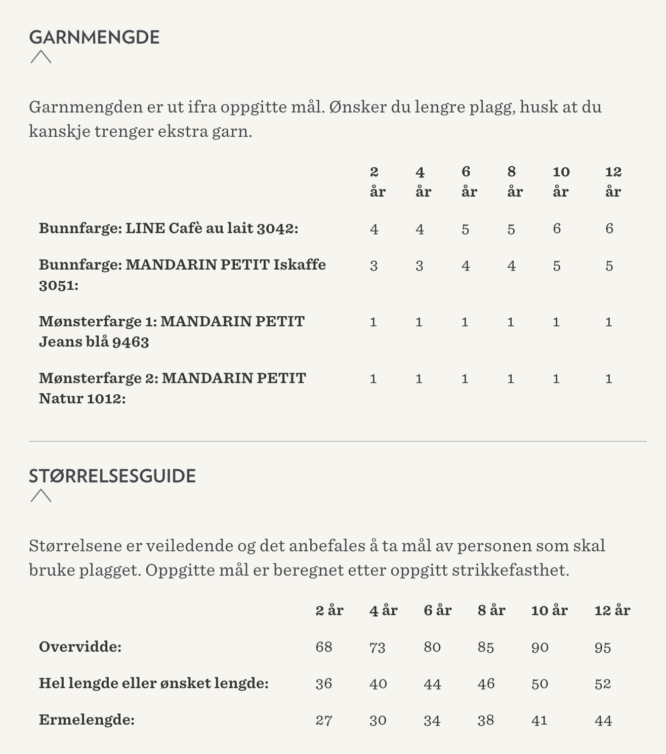 Bunnfargen strikkes med 1 tråd Line og 1 tråd Mandarin Petit. Mønsterfargene strikkes med 1 tråd Mandarin Petit. Først strikkes bakstykket frem og tilbake med vendepinner for å forme skrå skuldre og deretter strikkes bakstykket ned til under ermene. Videre strikkes det opp masker langs oppleggskanten på bakstykket i hver side til forstykker som strikkes for seg. Det strikkes vendepinner for å forme skrå skuldre og økninger til halsutringning, før forstykkene strikkes sammen til samme lengde som bakstykket. Fra under ermene strikkes for- og bakstykket sammen. Ermer og halskant strikkes til slutt.