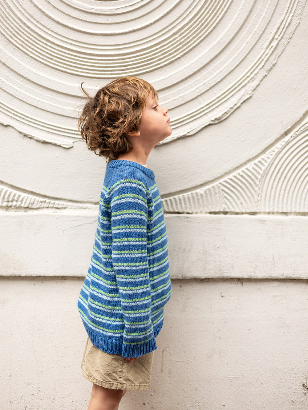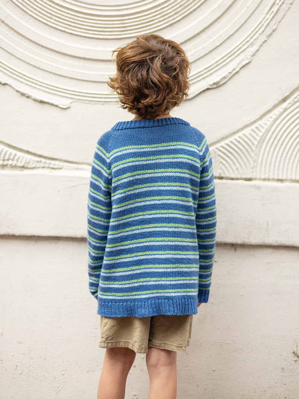 Genseren strikkes ovenfra og ned med stripemønster med to tråder Tynn Line.