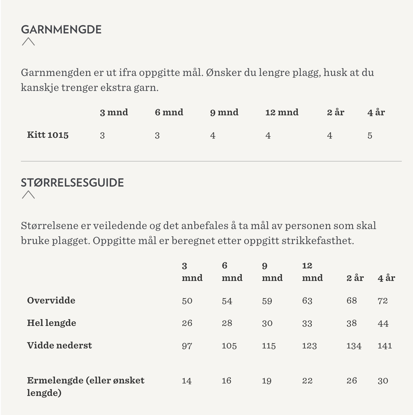 for seg. Det økes masker til peplum og felles av til en stødig kant som ikke ruller. Ermene strikkes rundt i glattstrikk og avsluttes med samme kant som på bolen. Til slutt strikkes det i-cord kant rundt halsen.