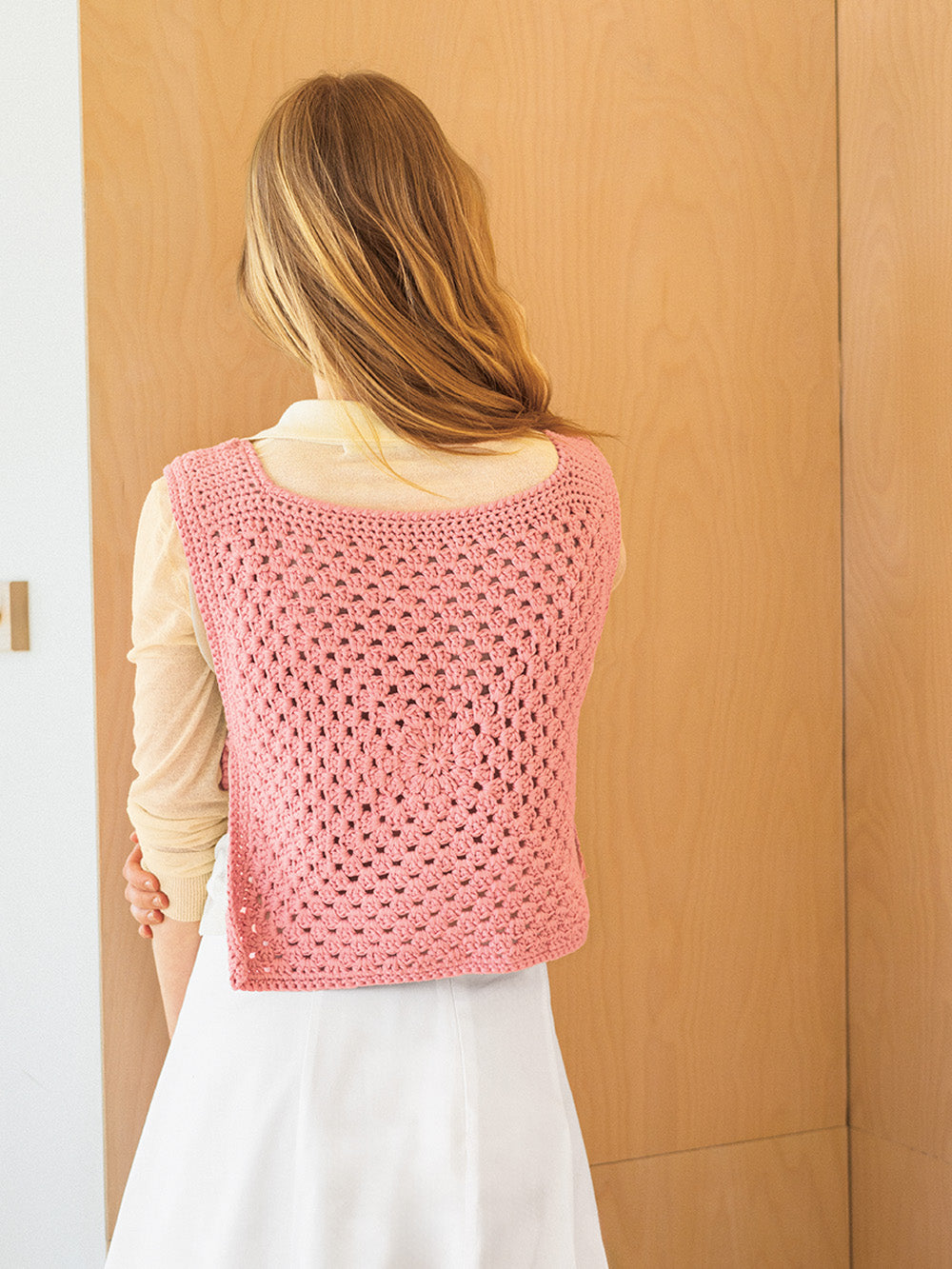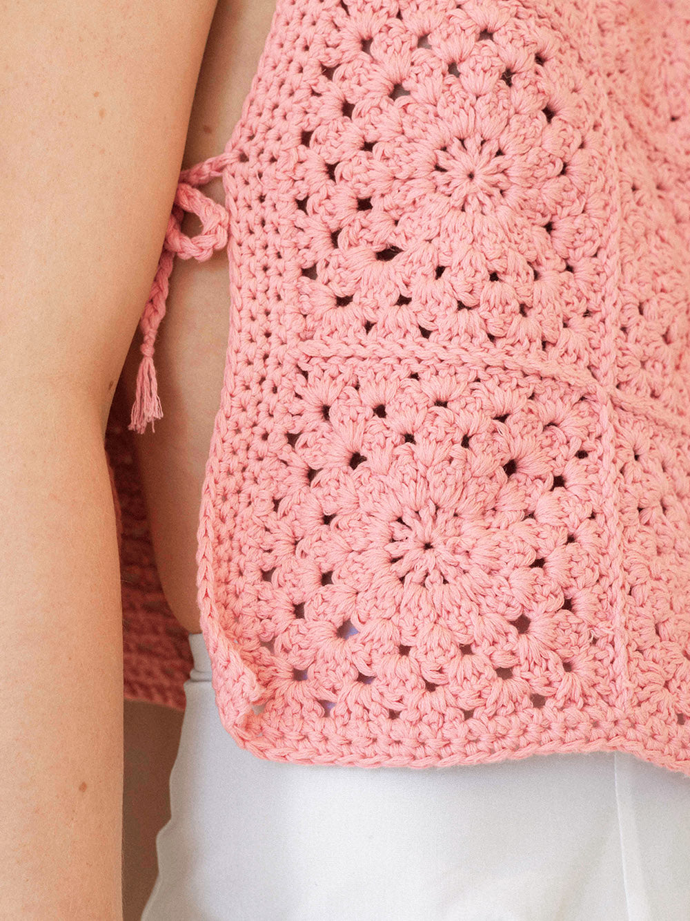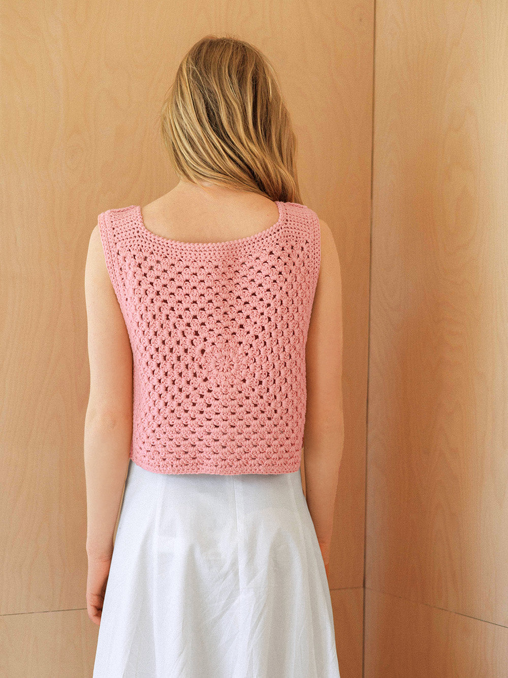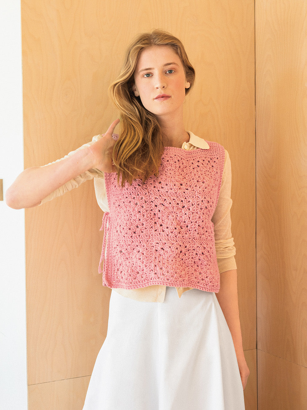 Først hekles det 9 små ruter som sys sammen til et forstykke, det hekles fm frem og tilbake over øverste kant til skuldre. Videre hekles det 1 stor rute til et bakstykke, det hekles fm frem og tilbake over øverste kant til skuldre. Skuldrene sys sammen og det hekles en halskant. Til slutt hekles det en kant i hver side før det hekles snor til knyting.