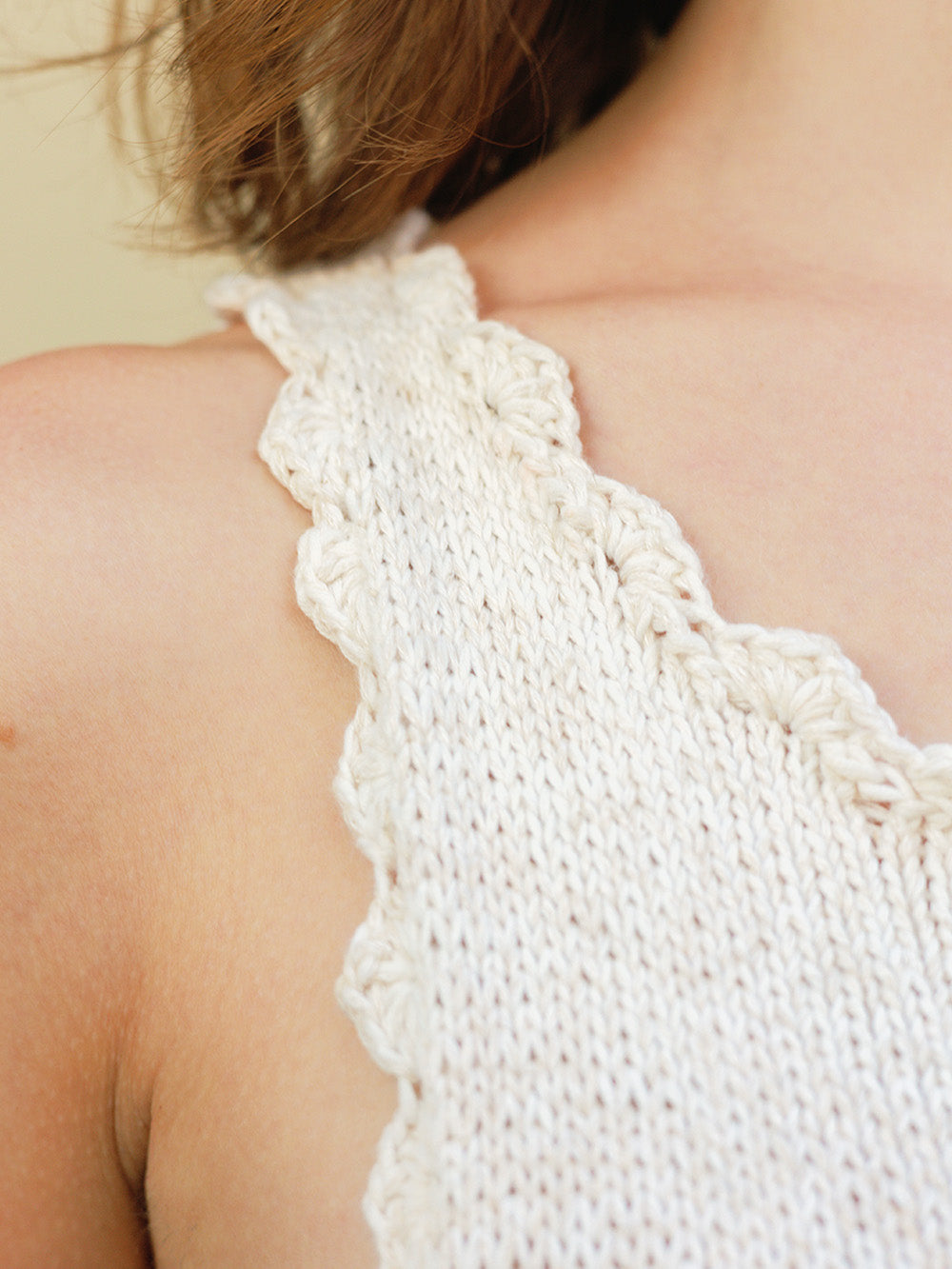 Det felles masker til en lett A-fasong. Arbeidet deles under ermene, og forstykket og bakstykket strikkes frem og tilbake ferdig for seg. Det felles av masker midt foran og midt bak til en dypere halsutringning, og hver side av forstykket og bakstykket strikkes ferdig for seg. Skuldrene strikkes sammen under montering. Til slutt hekles det tungekant nede på skjørtet, ermehull og hals.