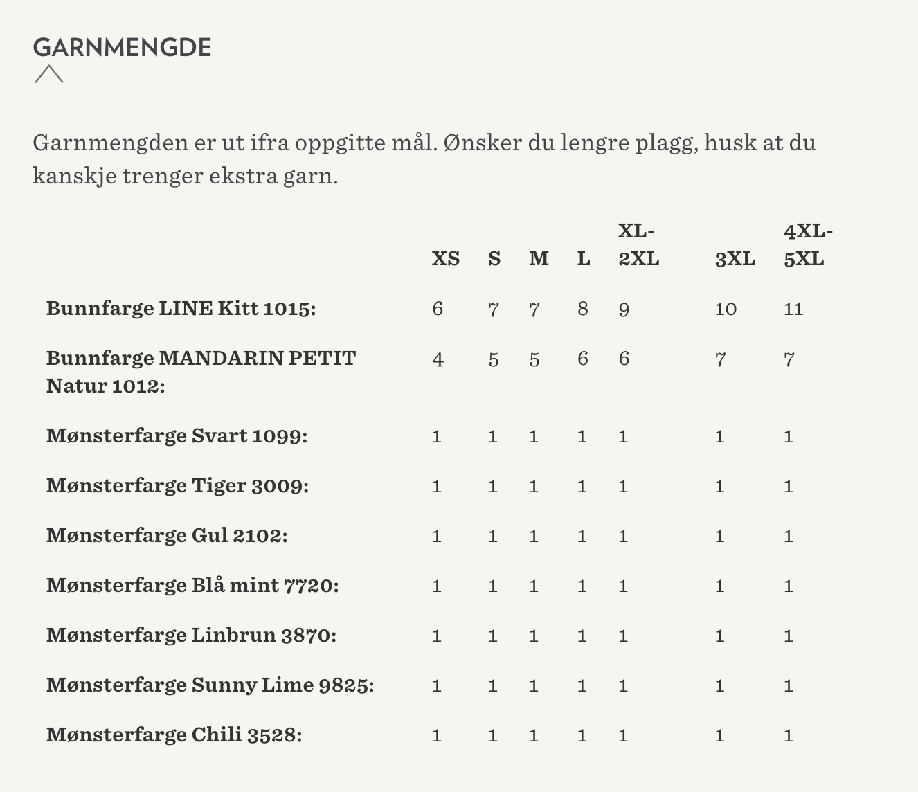 Genseren strikkes ovenfra og ned i halvpatent med striper i perleribb. Bunnfargen strikkes med 1 tråd Line + 1 tråd Mandarin Petit. Mønsterfargene strikkes med 1 tråd Mandarin Petit.