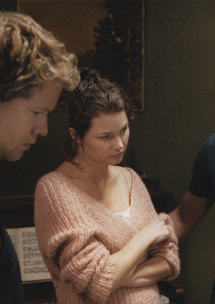 Dette er jakken Lillian (spilt av Iben Akerlie) har på seg i filmen De dødes tjern, og den er strikket med halvpatent og v-hals i KOS.