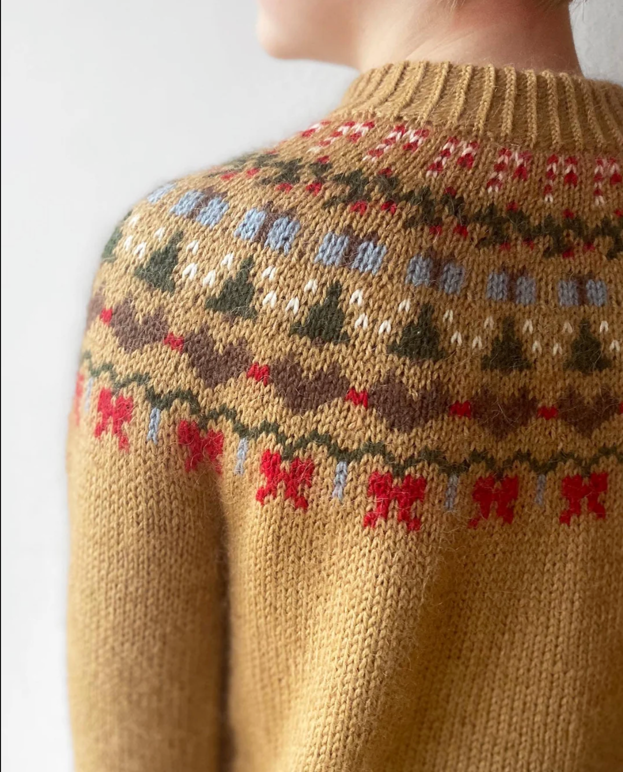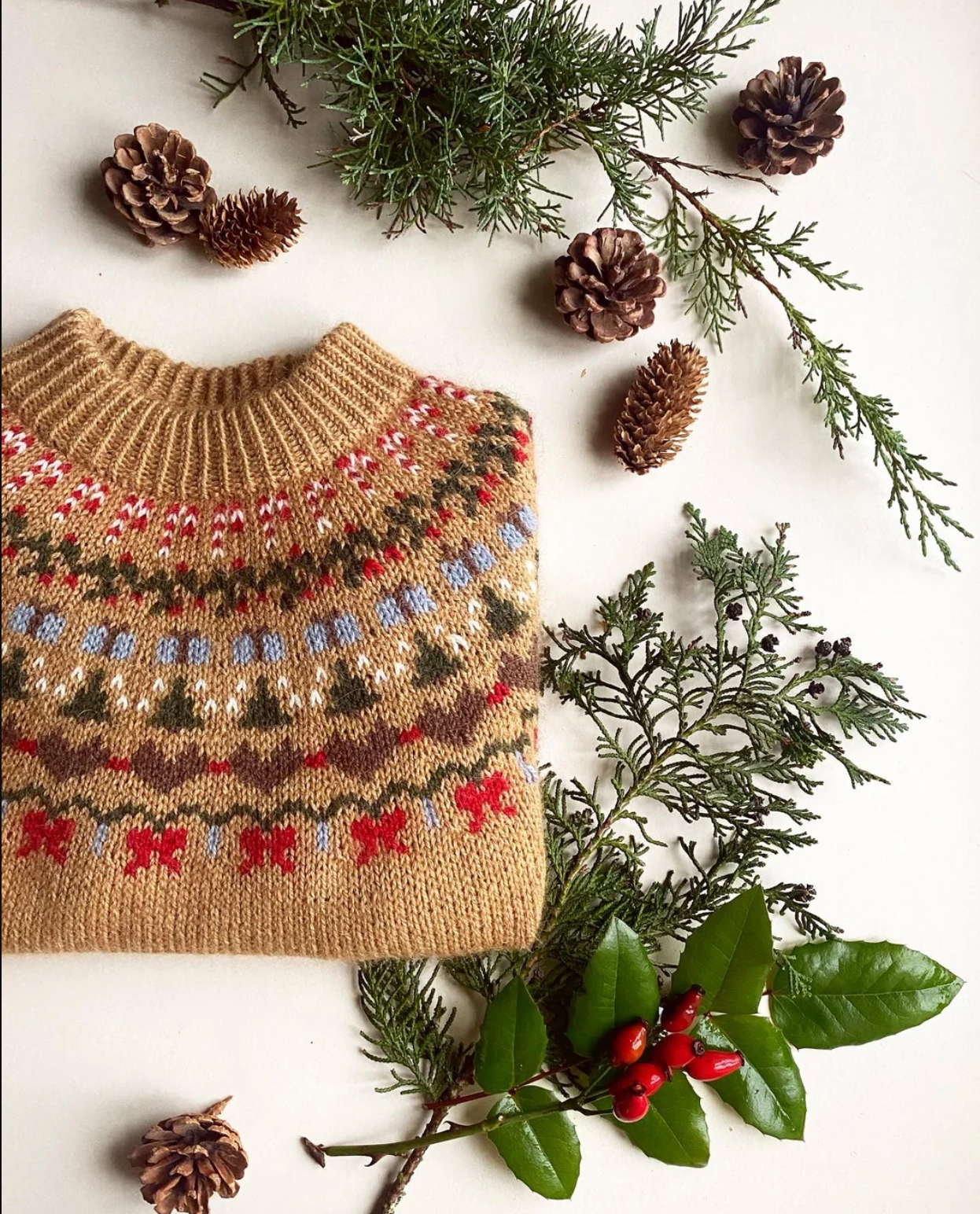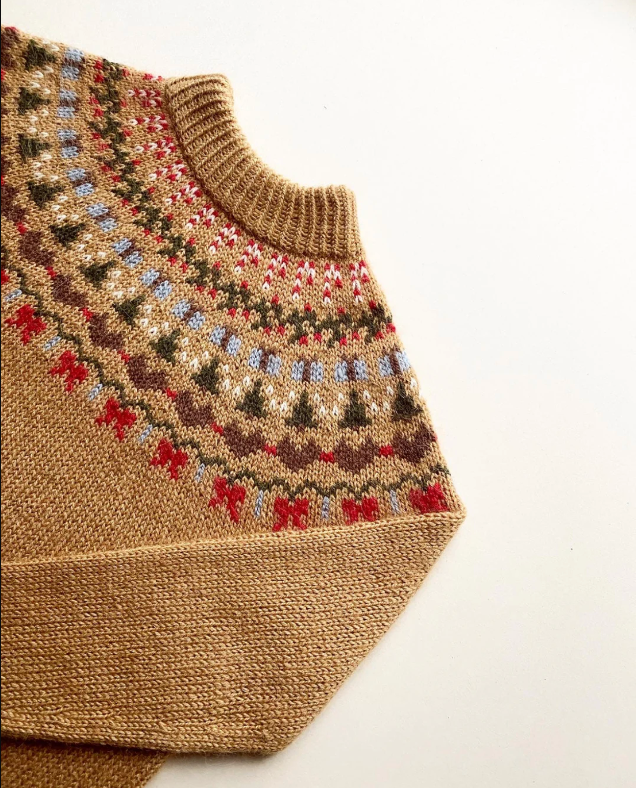 Arbeidsgang: Genseren strikkes ovenfra og ned i glattstrikk. På bærestykket strikkes det etter et flerfarget mønsterdiagram. Alle kanter er i vridd ribb.
