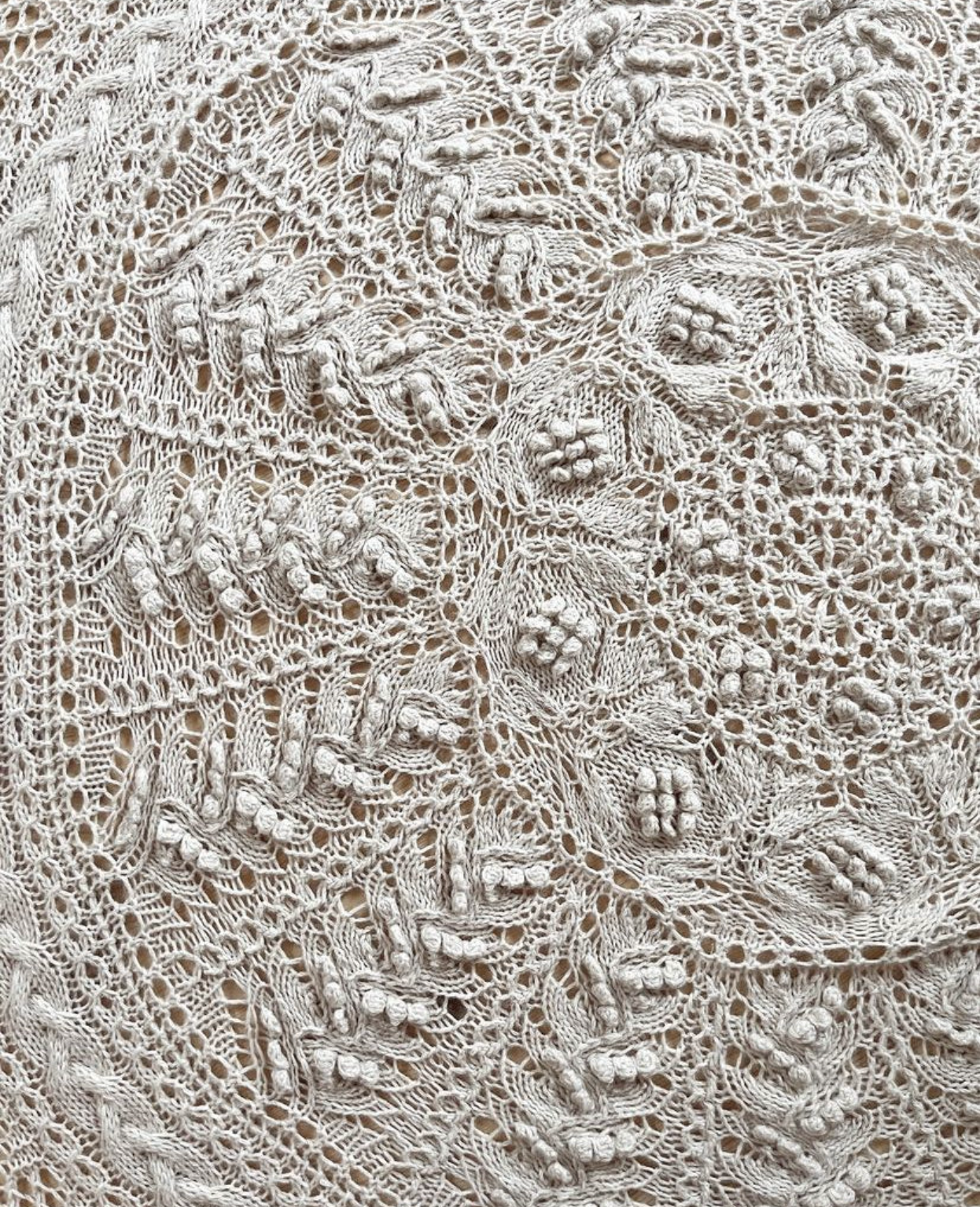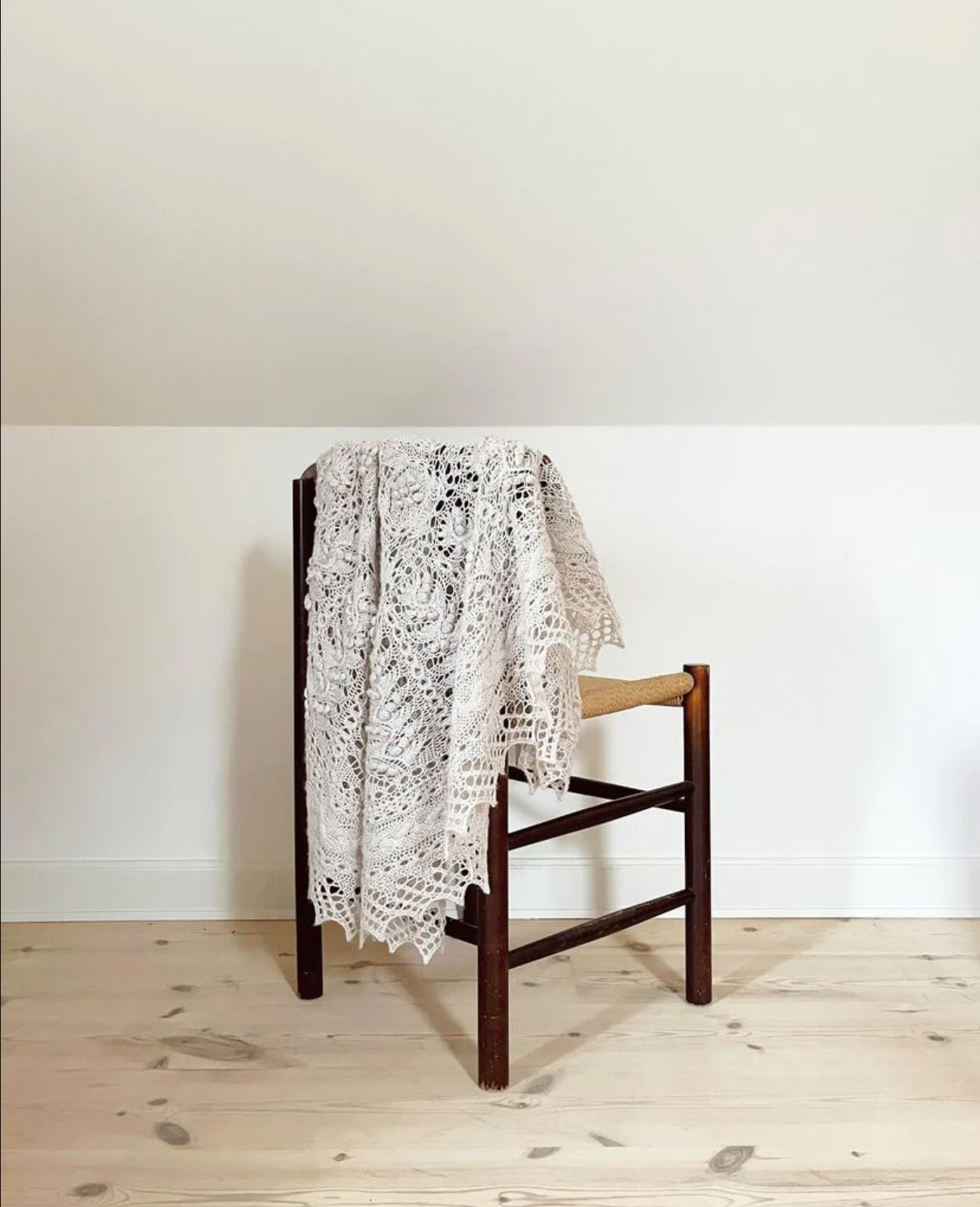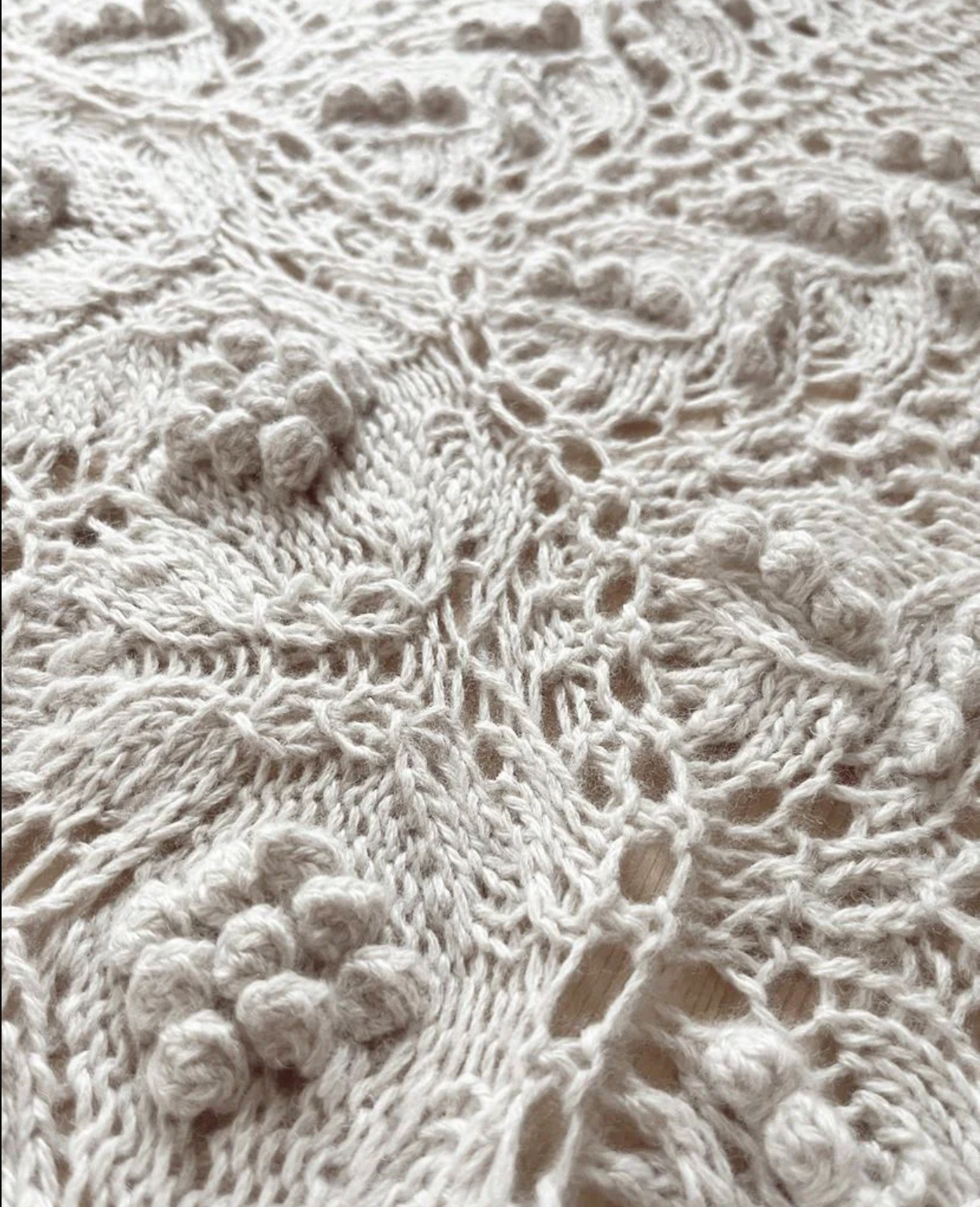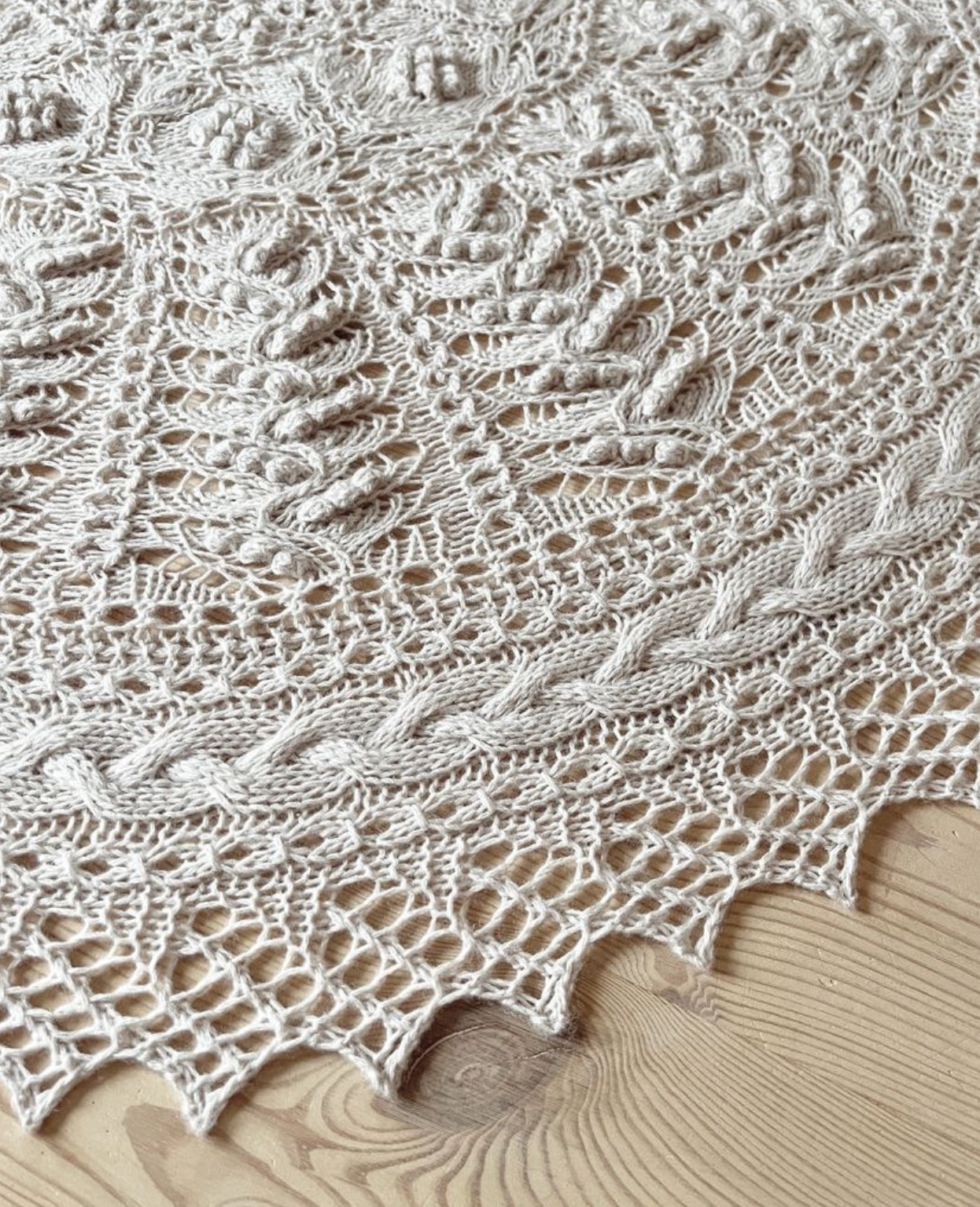 Arbeidsgang: Ut fra et sett av mønsterrapporter og diagrammer, strikkes dette teppet rundt i hullmønstret glattstrikk – startende fra teppets senter og ut. Avslutningsvis strikkes det på en blondekant vinkelrett på teppet.