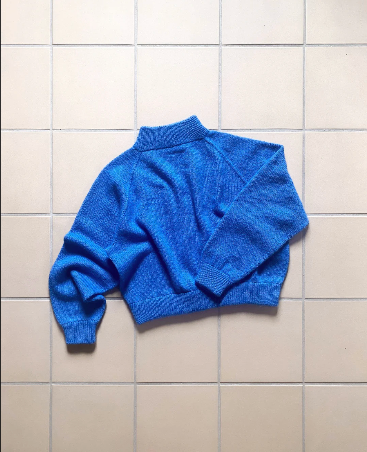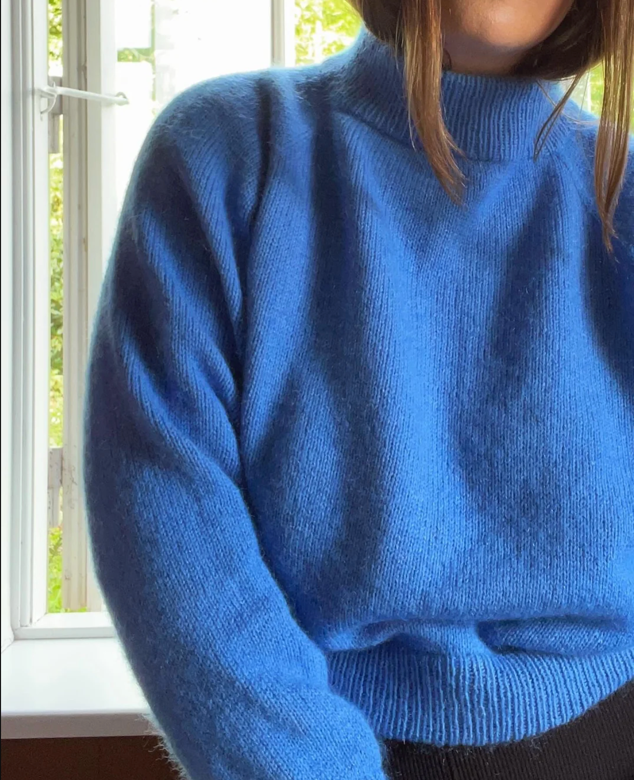 Arbeidsgang: Denne blusen strikkes rundt ovenfra og ned i glattstrikk med raglanøkninger på bærestykket. Blusen har brede brettekanter i ribb, ermer som smalner gradvis, og en tettsittende bunnkant.