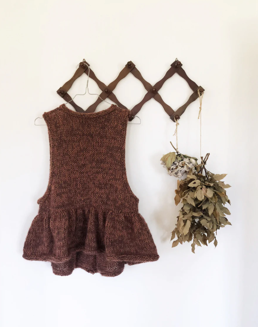 Work: The front and back of the vest are first knitted separately back and forth in stocking stitch. Then the pieces are joined to form the body and then knitted in the round in stocking stitch. Before starting the skirt, an elevation is knitted at the back using the German short rows technique to make the vest longer at the back. The skirt is formed using increases and finished with an i-cord edge. Then, sts are picked up in the round along the armhole and then knitted on an i-cord edge. The same method is used at the neckline, which also has a finishing i-cord edge.