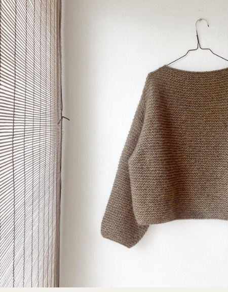 Working procedure: The sweater is knitted top down in garter stitch with increases along the shoulders, as well as wide, finishing garter stitch edges.