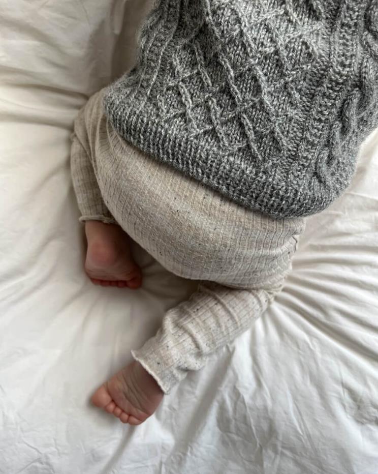 Moby Slipover Baby is knitted top down with textured and cable knit. First the back piece is knitted, then stitches are picked up to the shoulders, which are gathered at the front to form the front piece. The front and back pieces are gathered under the armhole to form the body, which is knitted straight down. Finally, rib edges are knitted at the neck and sleeve openings.