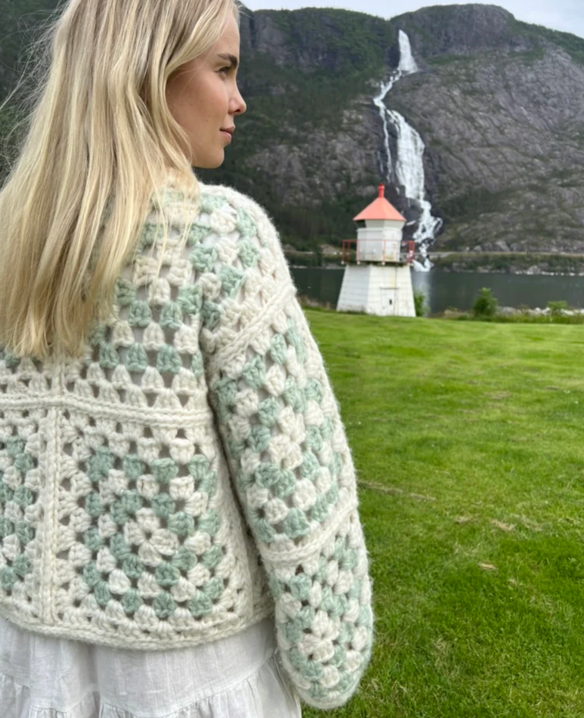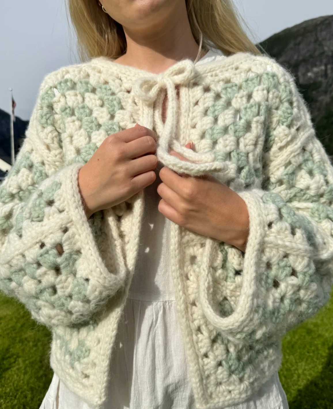 BESTO CARDIGAN is an oversized cardigan made of granny squares. The granny squares are crocheted in double strand blow yarn, which makes it both very light and super soft!