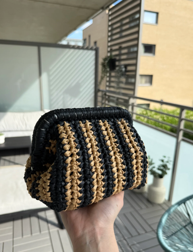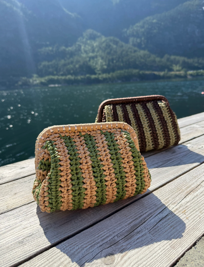 BEA CLUTCH er en stripete, sommerlig clutch som hekles i dobbel tråd Ra-Ra Raffia. Den består kun av luftmasker og fastmasker, og er derfor både enkel og rask å lage – perfekt for både nybegynnere og mer erfarne heklerne.