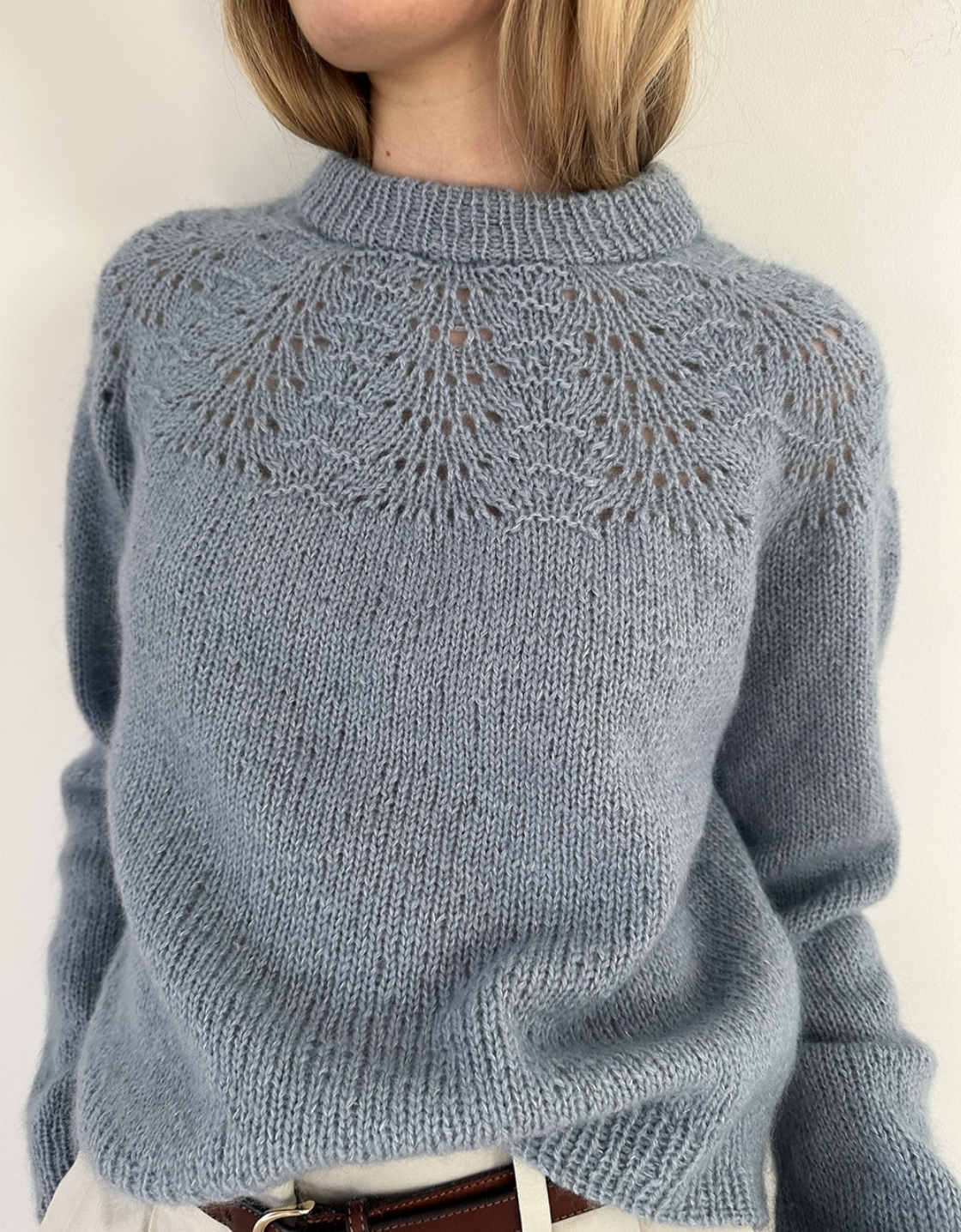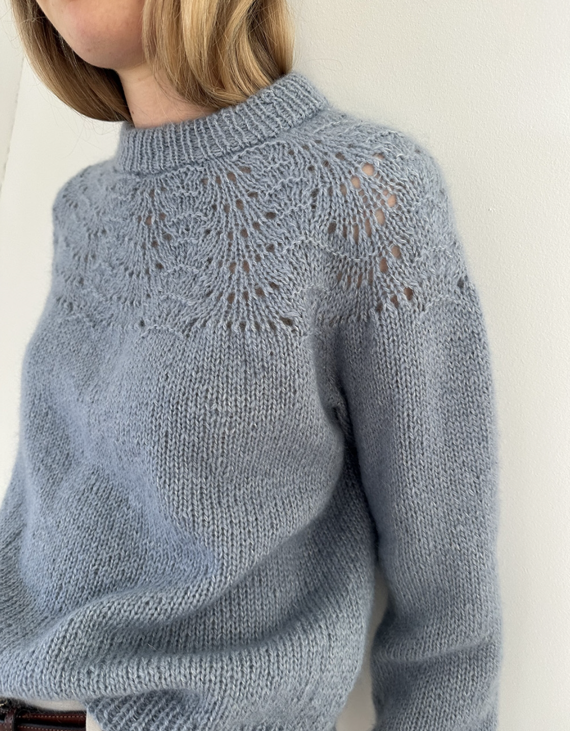 The lace pattern on the yoke is both fun and easy to knit. The Peacock Jumper is knitted top down, and is knitted higher in the back than in the front. It is short and slightly loose fitting.