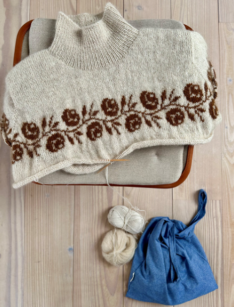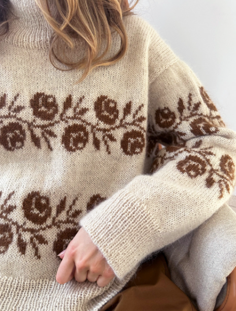 Rosie Sweater har to roseborder på bol og ermer, og den snedige konstruksjonen er en kombinasjon av ermekuppel og raglan, som vil si at alt mønsteret kan strikkes rundt fra rettsiden.
