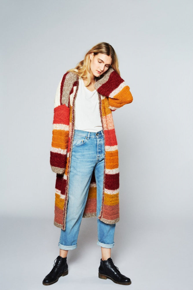 Wild Jacket is a vibrant and colorful long jacket, knitted on thick needles. Here we have played around with mixing different yarn qualities and textures. That makes knitting fun!