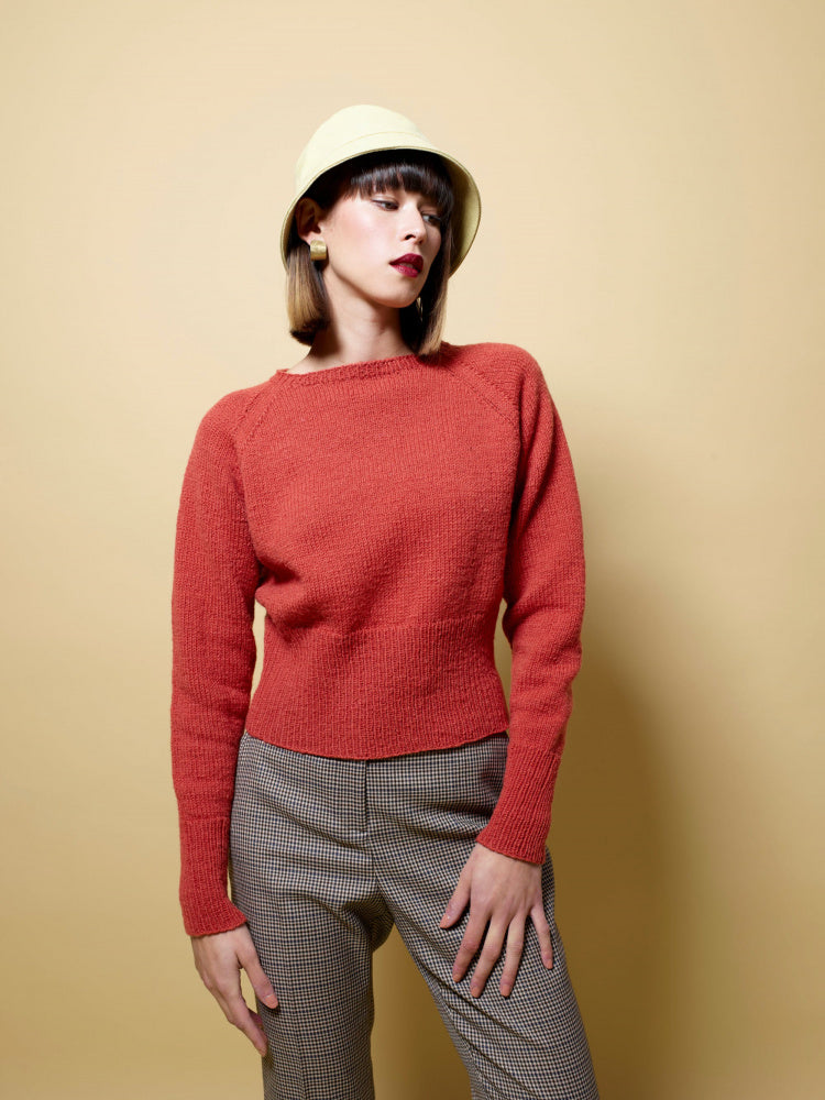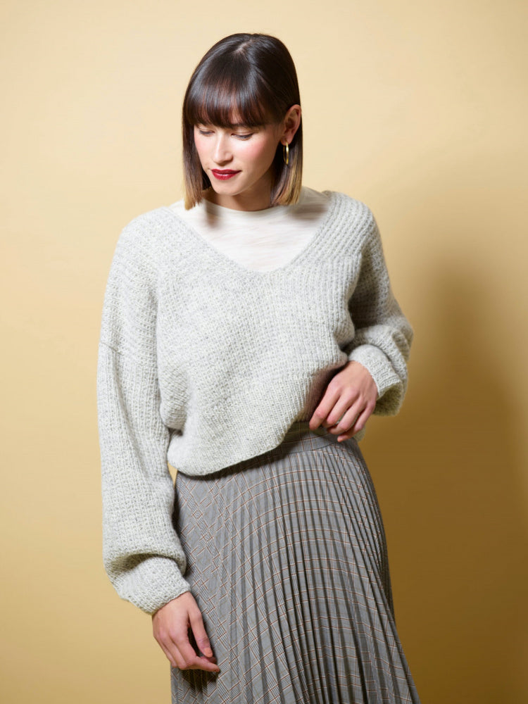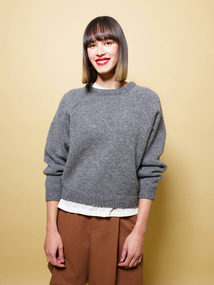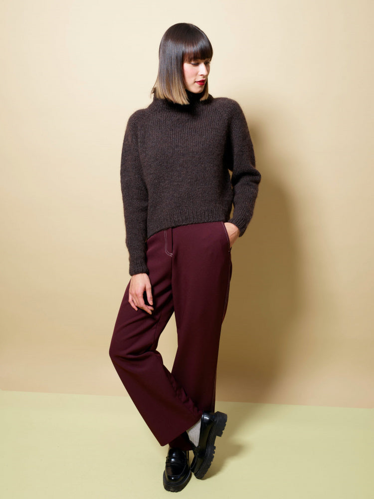 In this collection you can choose between the very simple patterns, and those that give you a little more trouble. Jori and Frya are both stockinette-knit raglan sweaters – one is knitted from the bottom up, the other from the top up. Sira is a really good and chunky sweater that is knitted from the top up. It has extra length at the back and a lovely high neck. It is knitted in a mixture of 3-ply and the mohair yarn Plum. Imsa is a v-neck sweater with a fun twist in the neckline and a simple structure. Eira is the pearl of the collection. It has a rib knit that slopes outwards and is knitted in a mixture of 3-ply and Plum. Istra has braids all over, so here you have to keep your tongue in your mouth, but oh my, so much fun to knit! Most of the sweaters are short at the waist and go well with dresses, or with trousers and skirts with a high waist. If you like them a little longer, just knit a few extra cm. It's okay to do your own thing, like the streams in spring that find their own way!