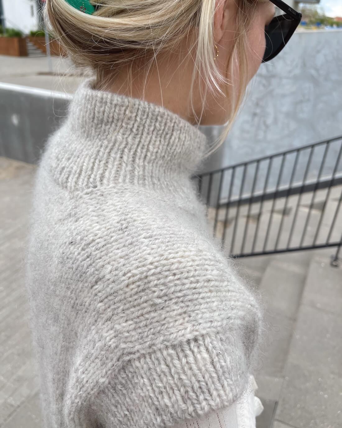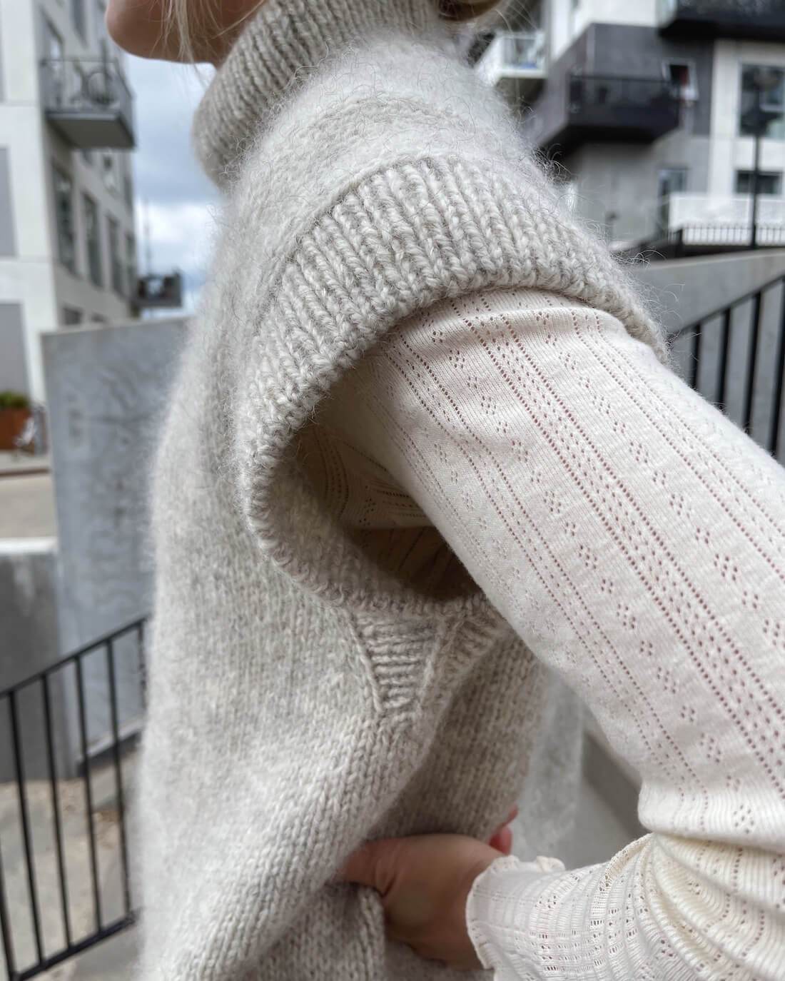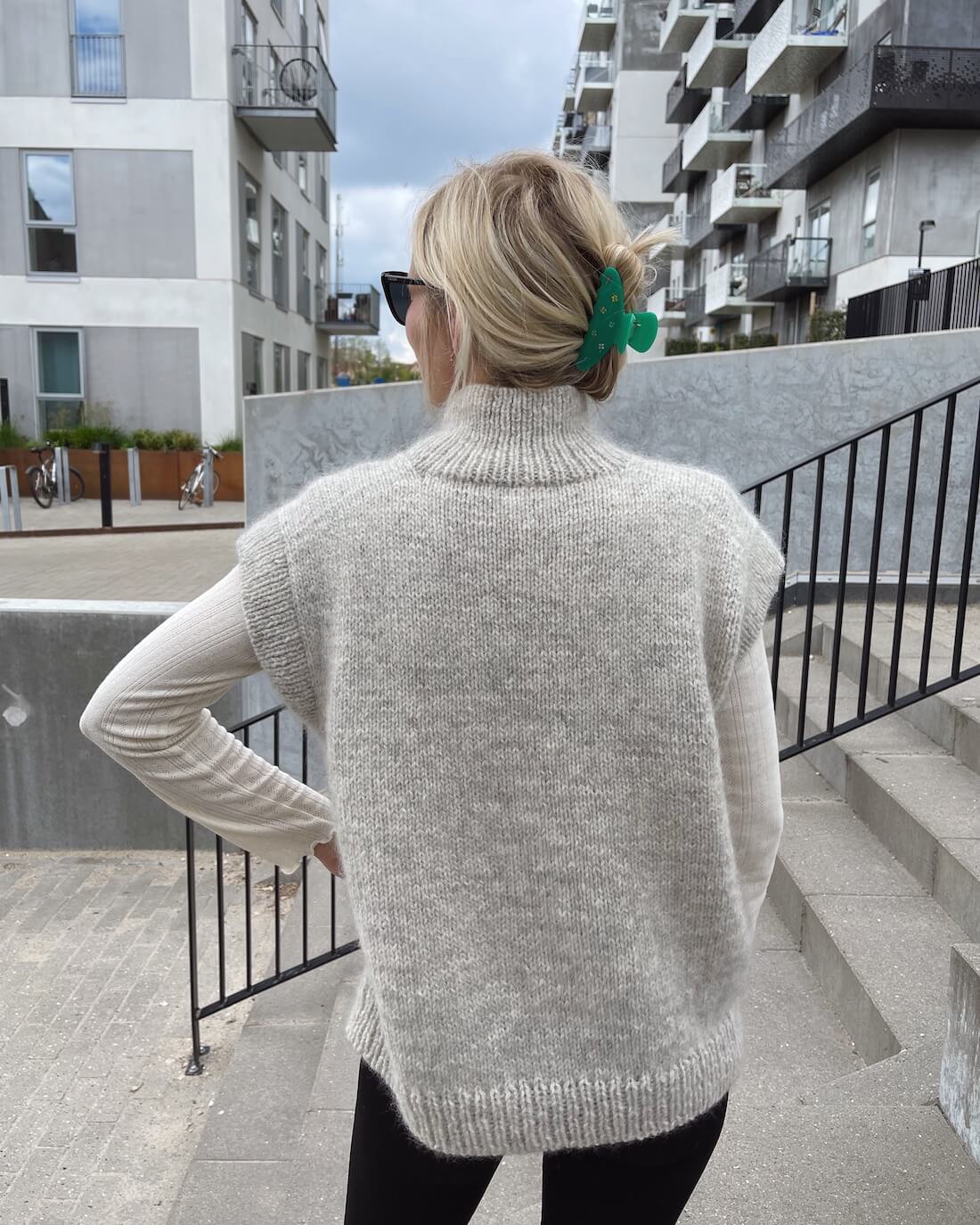The gray Weekend Slipover is knitted in Håndværkgarn from Hjelholts Uldspinderi in the color Sand together with Soft Silk Mohair from Knitting for Olive in the color Marzipan.