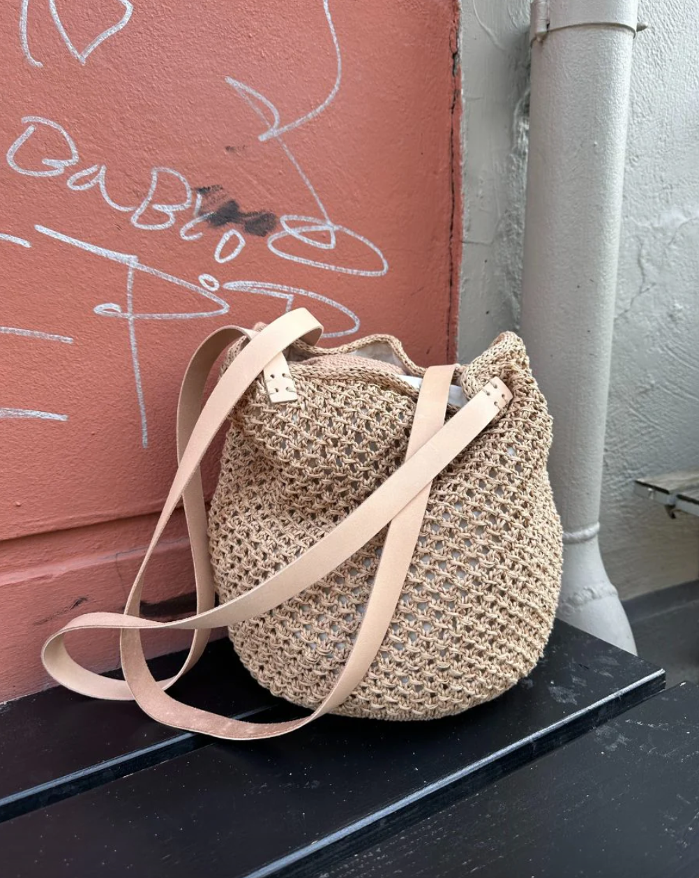 Materials : 150 (200) g Japanese Cotton from Isager Yarn (50 g = 315 m) or 250 (350) g Crealino from Lang Yarns (50 g = 165 m), cotton fabric for lining: 96 x 27 (112 x 30) cm, shoulder straps in core leather: 2 x 94 cm