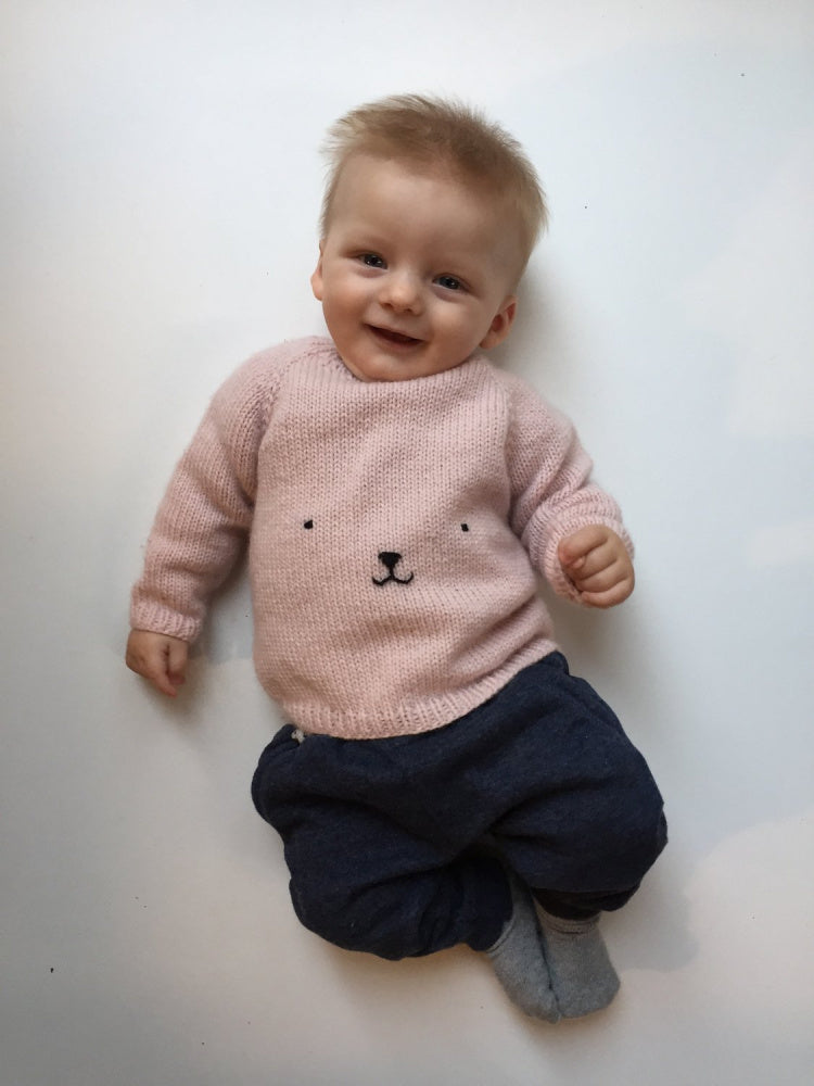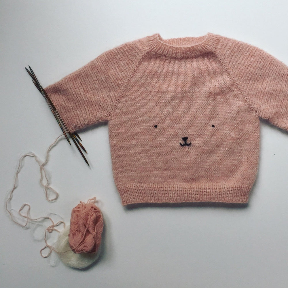 The teddy bear sweater is knitted top down with raglan increases, and the neckline is knitted using short/reversible needles. A teddy bear face is embroidered on the front of the sweater.
