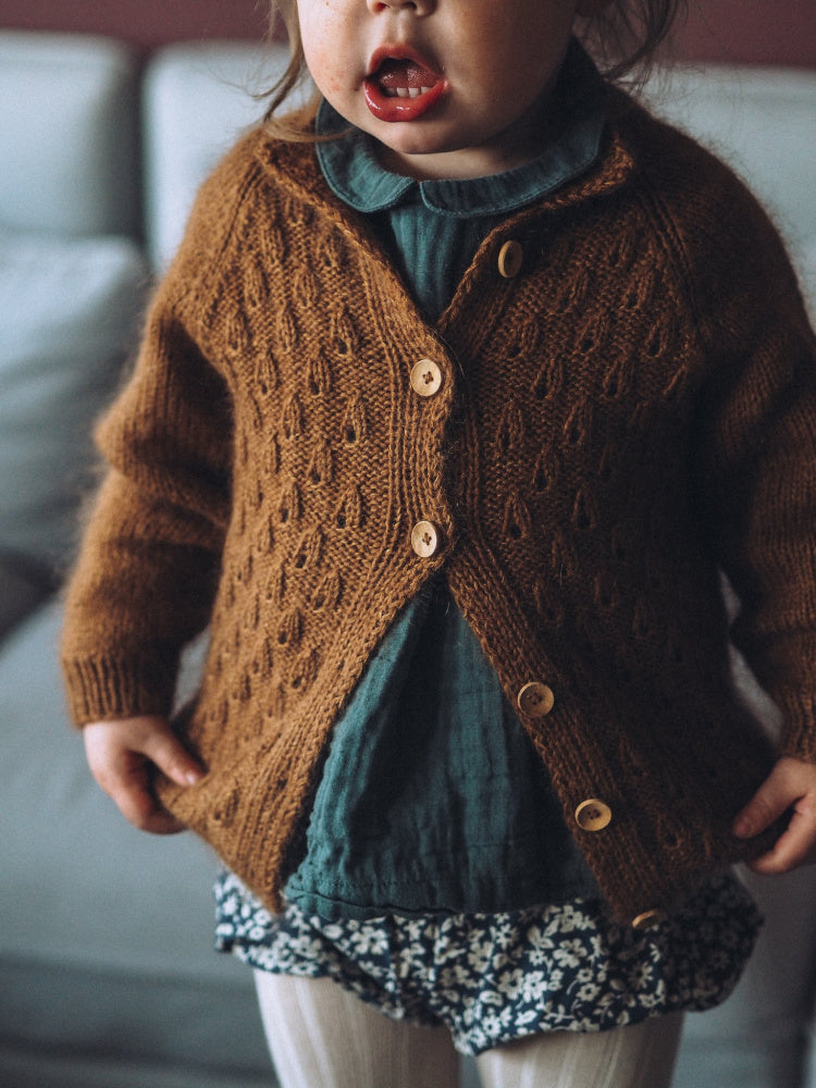 Dråpejakke is a jacket with a simple structural pattern reminiscent of drops. You can safely try this even if you are a beginner in structural knitting. The simple pattern is equally nice for both boys and girls.