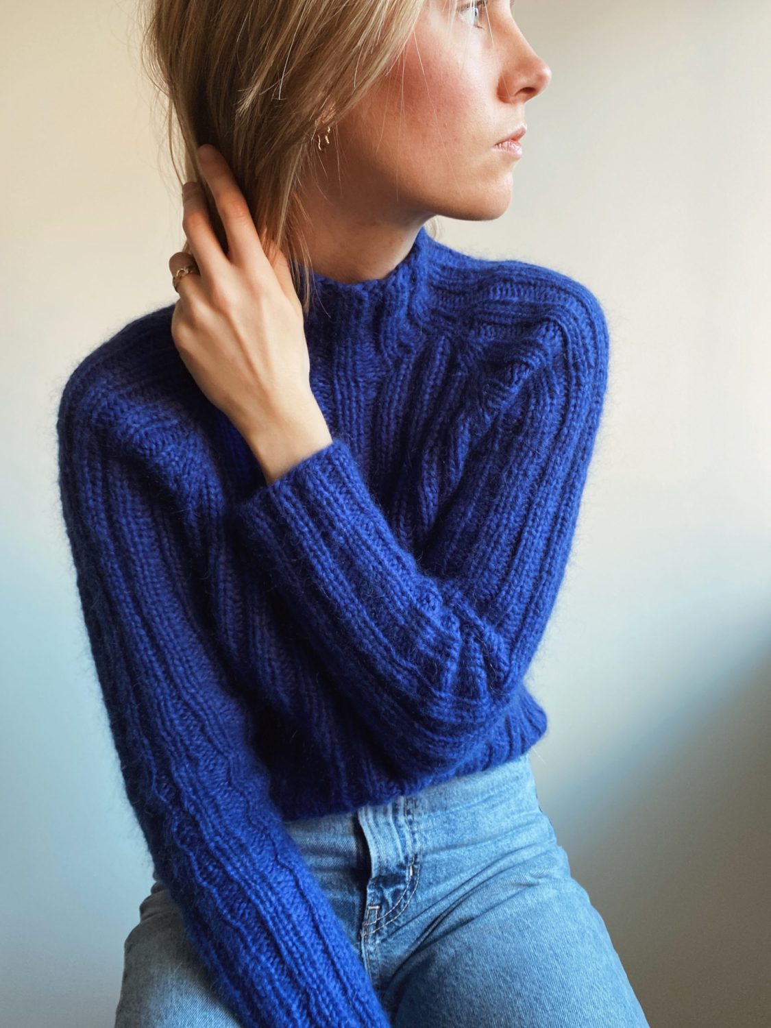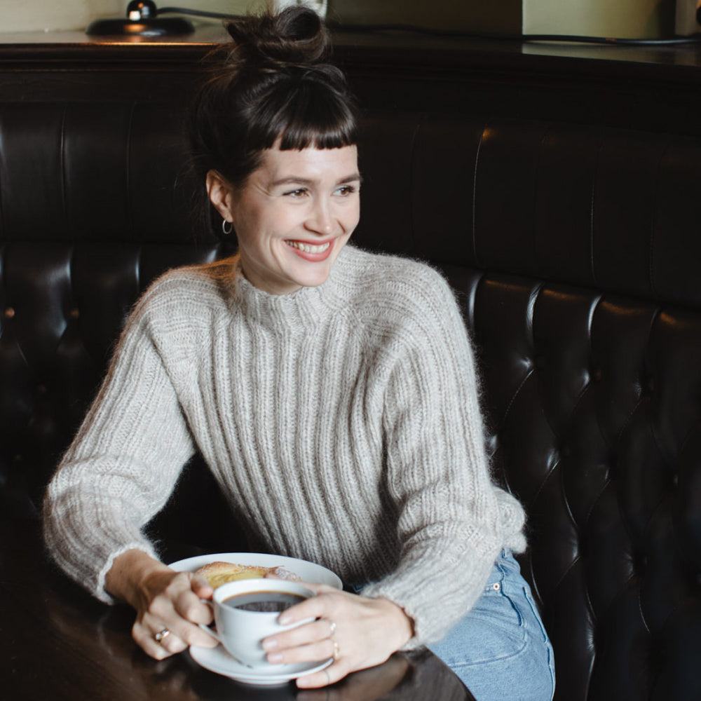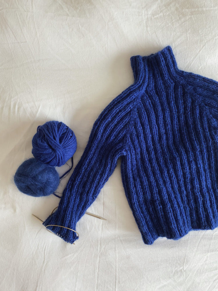 Ernie Sweater is a slim and elastic ribbed sweater, with a yarn composition that makes it warm and good in cold weather. The sweater is knitted from the top down. You cast on stitches for the neck and gradually increase evenly for the sleeves and yoke for raglan in an established rib pattern. The sweater is roomy at the armholes, but is otherwise narrow in the model. Since the entire sweater is knitted in rib, it can easily be shaped to the desired fit by steaming.